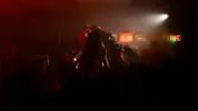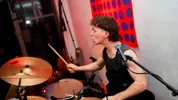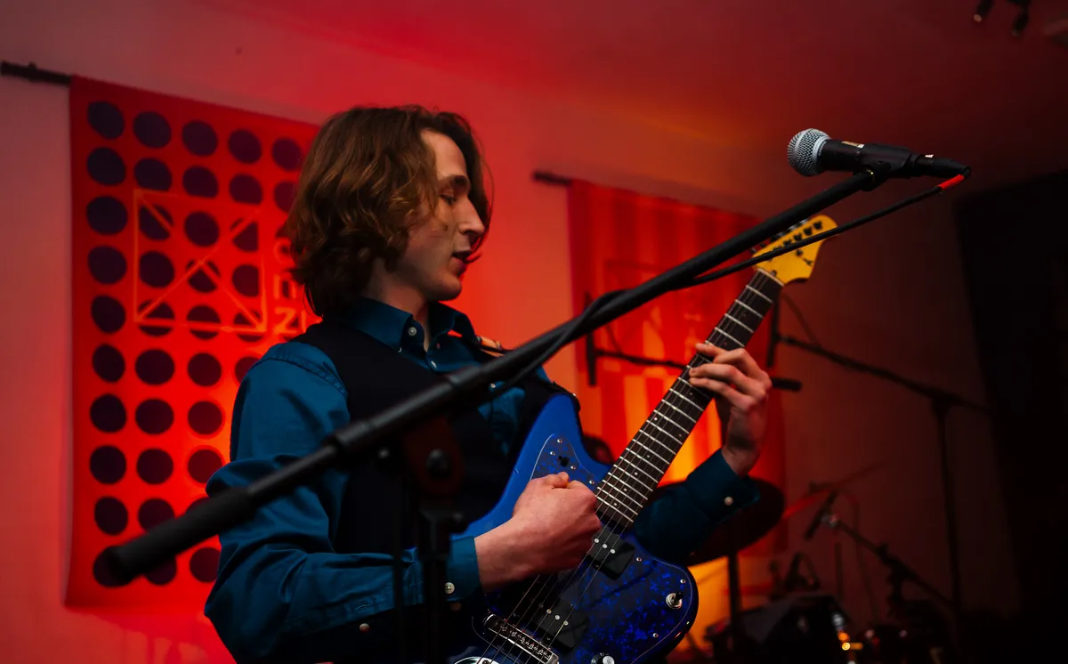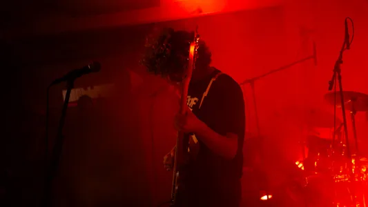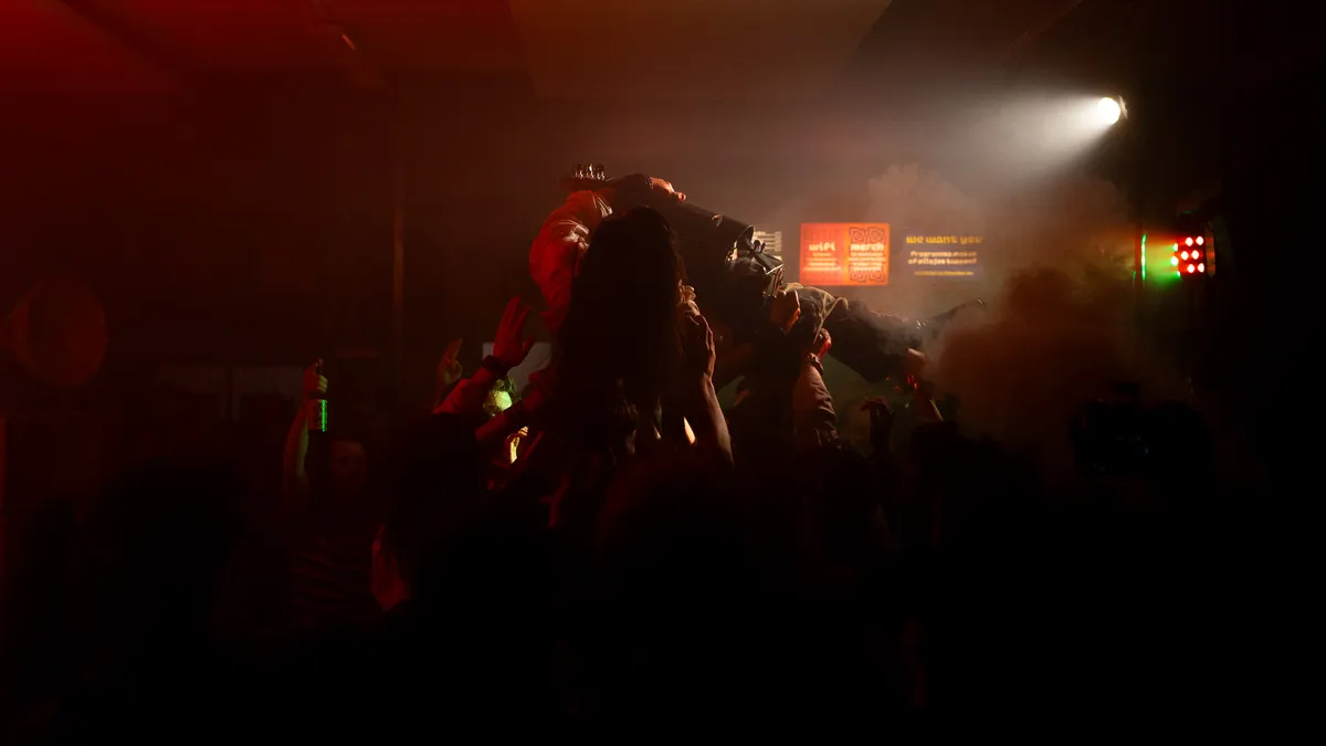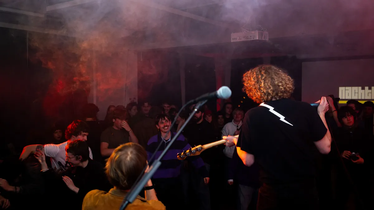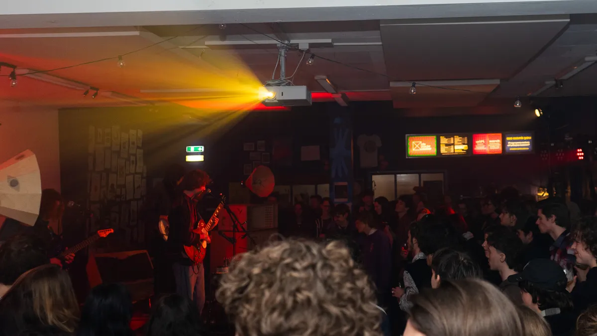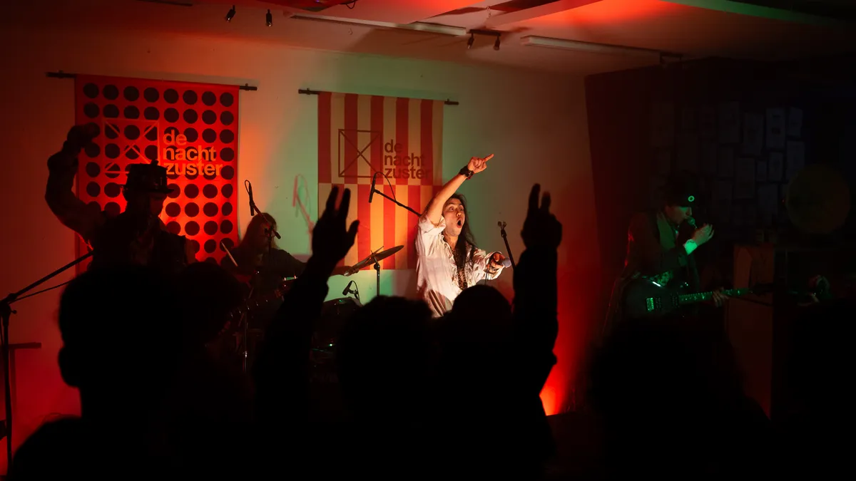 Na de tweede pauze waarbij er weer wordt omgeroepen dat er nog genoeg gerechten over zijn, o.a. een overheerlijke risotto gemaakt van wijn, begint de derde band van de avond: Eyesores. Een energieke punkband uit Harderwijk die al goed scoorde met singles ‘Road Rage’ en ‘Brainrot’, en daarnaast al op Paaspop 2024 heeft gestaan (met toen slechts één uigebrachte single!). We worden meteen meegenomen in een interactieve en intense performance. Tijdens het optreden komen er steeds meer mensen binnen om de band te bekijken. Er zijn meerdere moshpits en tijdens het laatste nummer roept de zanger van Eyesores: “Ik wil nu de grootste moshpit zien van vanavond!”. Waarop het publiek meteen een grote kring maakt en het laatste nummer start. Explosieve baslijnen en gitaarriffs klinken door de ruimte. De nummers die worden gespeeld zijn zeker niet voor iedereen; het zijn nummers voor wie echt durft te voelen. En dat is de kracht van Eyesores, ze willen niet alleen gehoord worden, maar begrepen.