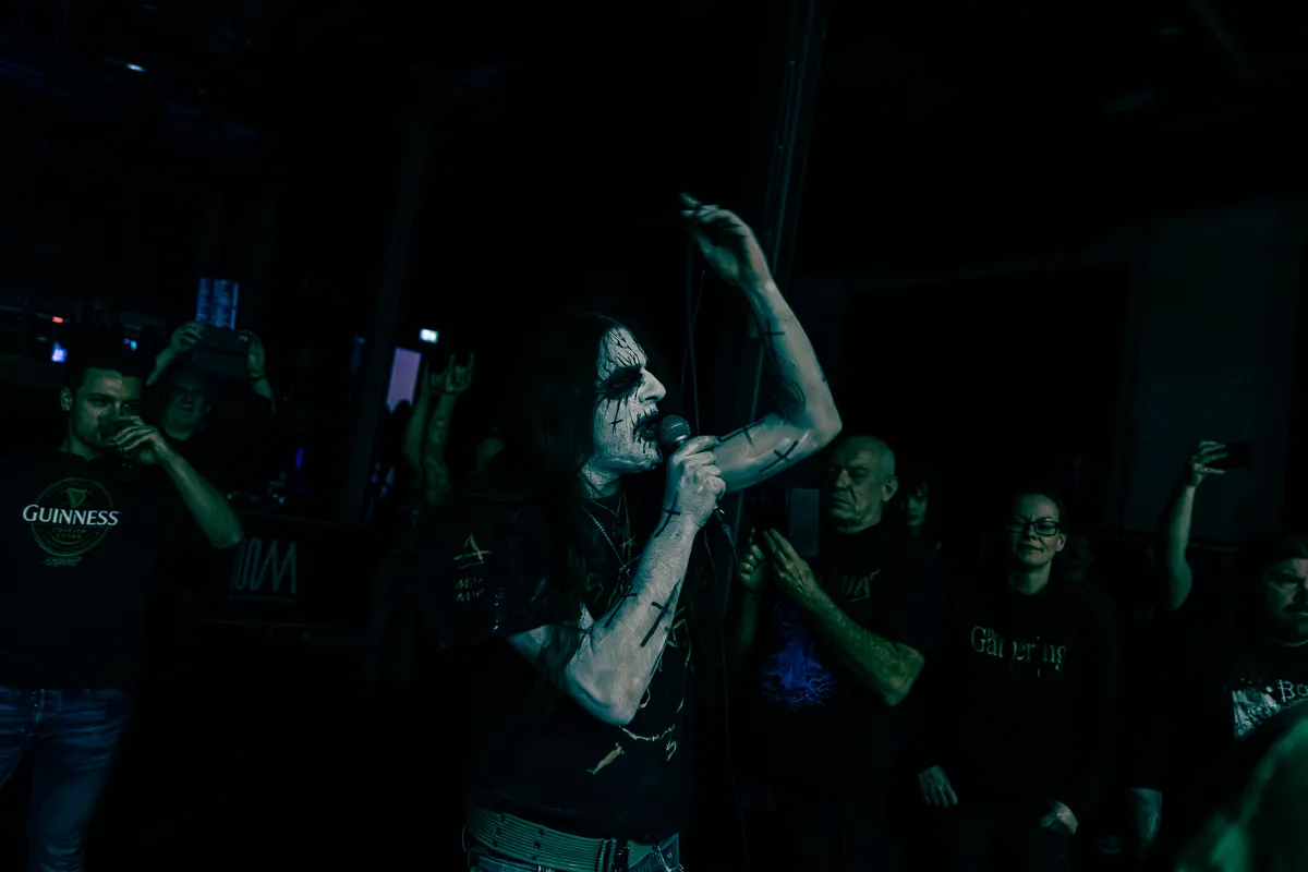 Oikonomopoulos blijft springen, huppelen en soms onhandig vallen, maar gaat even vrolijk verder vanaf zijn knieën. De cover van Rotting Christs ‘Non Serviam’ wordt gretig ontvangen, ook al is de frontman op dat moment zijn microfoon even kwijtgeraakt. Gelukkig biedt iemand uit het publiek een helpende hand.