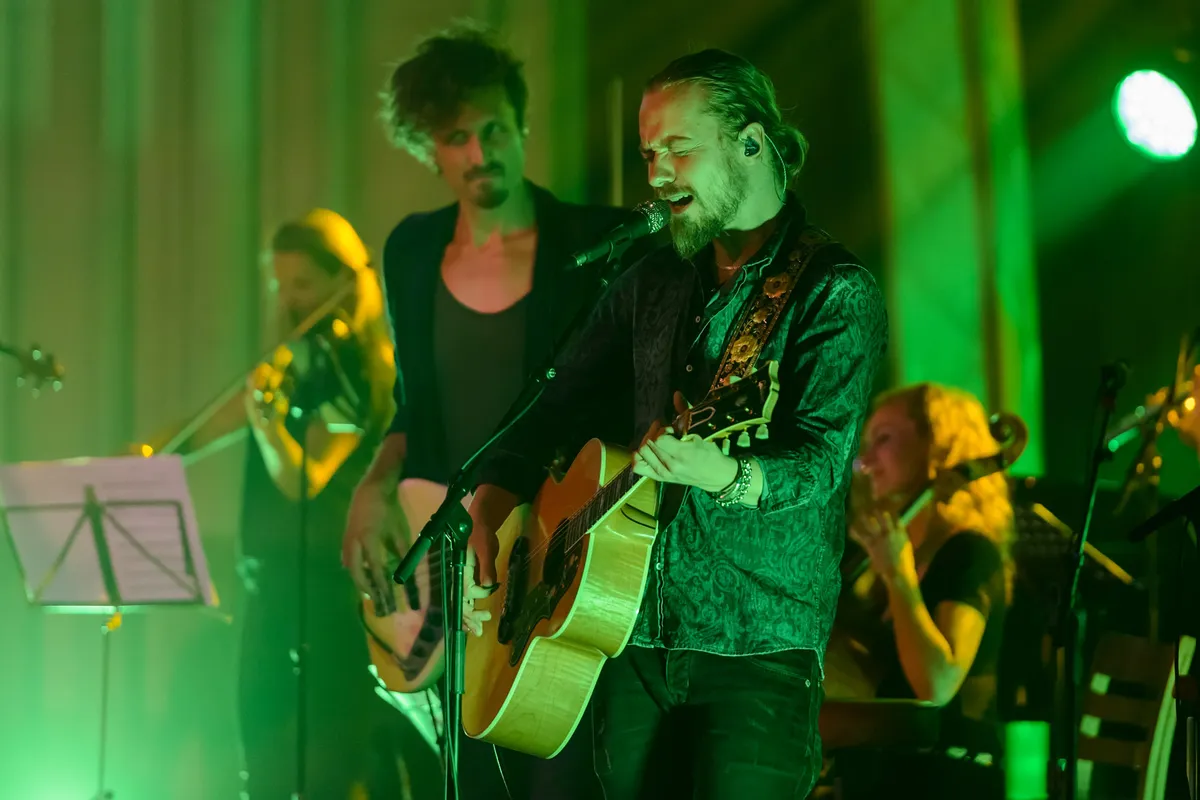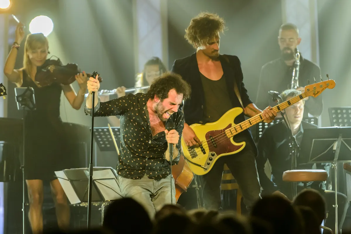 Op het podium onder meer: de bandleden van Navarone, strijkers, een harpist en een extra drummer. Opener: ‘Snake’ van het nieuwe album Oscillation. Op die plaat gierend en grommend met een gemeen bulderende riff, maar vanavond klinkt het als dreigende muziek bij een horrorfilm. Het is filmisch, breed uitgesponnen met een indrukwekkende bijdrage van onder andere de violisten en harpiste. Misschien is die film-associatie ook niet gek, want zanger Merijn van Haren geeft tijdens het introductiegesprek met Marike Jager al aan dat 50 procent van de muziek die hij thuis draait filmmuziek is.