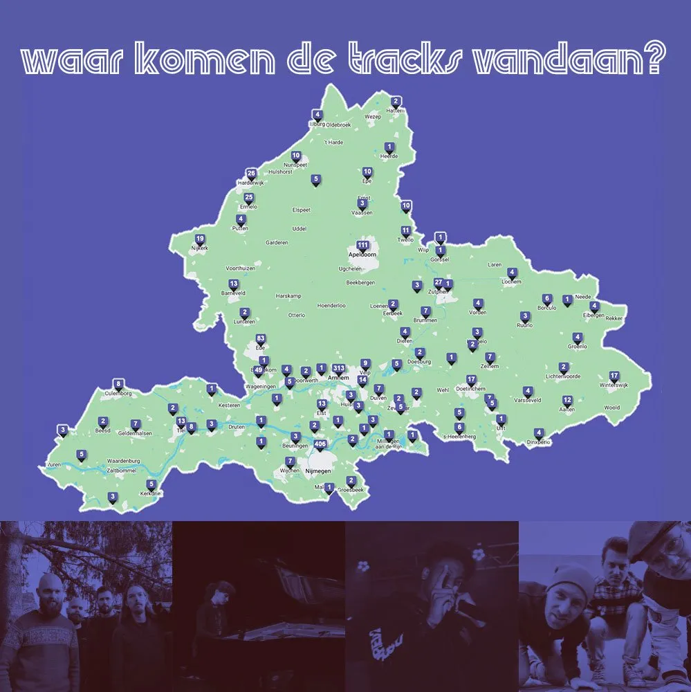 In de playlist staan artiesten uit álle hoeken van onze provincie: uit 98 Gelderse plaatsen om precies te zijn. De meeste acts uit de lijst komen net als vorige jaar uit Nijmegen, Arnhem, Apeldoorn, Ede en Wageningen. Alleen vorig jaar werden plek 4 en 5 nog gedeeld met Harderwijk en Zutphen, deze steden vallen nu net buiten de top 5.