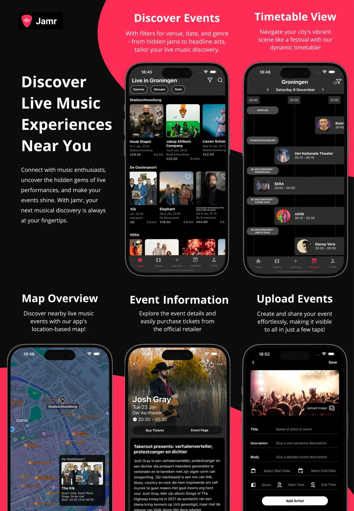 Fijne hulp, alleen zelfs dan kost het hem een goede acht maanden voor de app af is. De proefversie gaat in december online. Dan krijgt het ook zijn naam: Jamr. „De naam is gekozen omdat het idee ontstond omdat ik geen jamsessies kon vinden. De app is nu veel breder en kan voor allerlei muziekevenementen worden gebruikt, maar de naam is blijven hangen. Een goede vriend is later aangehaakt en heeft geholpen met de vormgeving. Hij heeft ook het logo ontworpen.”