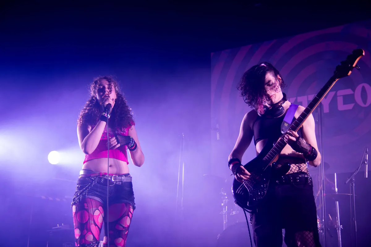 ‘Wat een crazy coole outfits’ en ‘damn, kijk die roze mouwen’ klinkt het vanuit de zaal vlak voordat Kittycore het podium bestormt. Gekleed in kapotte en visnetpanties, croptops en kattenoortjes in de kleuren zwart, neonroze en zilver is de band inderdaad een niet te missen verschijning, ze maken al indruk voor ze überhaupt zijn begonnen met spelen. Frontvrouw Fay Corstjens komt op op die miauw-versie van Billie Eilish’ 'What Was I Made For', waarna de muzikanten hun instrumenten inzetten en de complete zaal omver dreunen. Hun blend tussen pop en metal is ruig, rauw en gaat door merg en been. Hier staat een band die dondersgoed weet wat hij wil: schuren en onweerstaanbaar zijn.