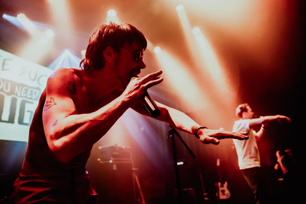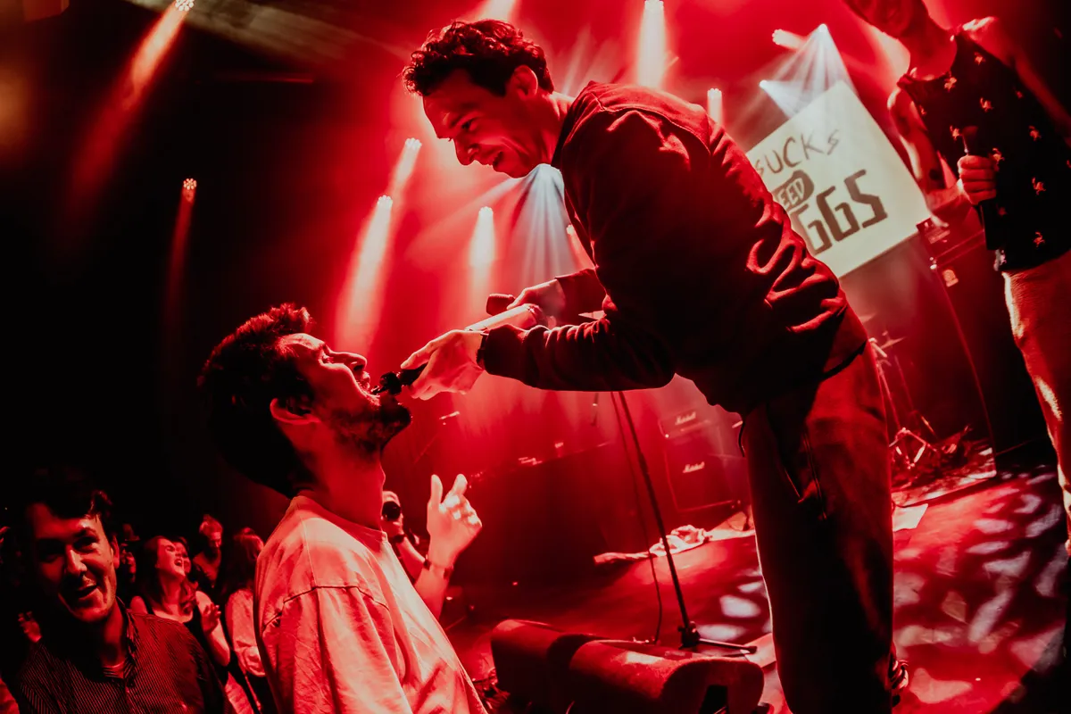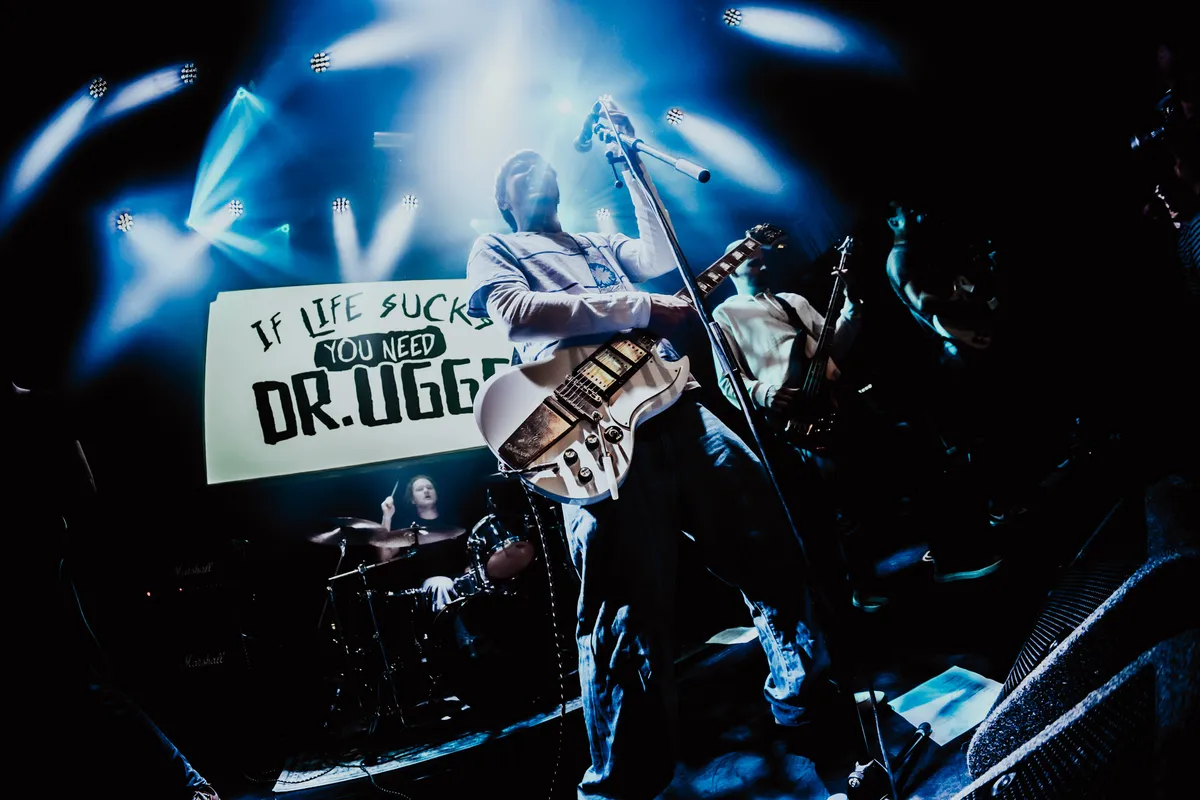 We wilden het met BITTERZOET, maar na de pauze krijgen we het met Dr. Uggs: een volledige band. Drie gitaren, bas en drums. Hatsikidee. Weg is de hippe hopper. Weg is de studentensociëteitvibe: punkrock Dr. Uggs. Hoewel… Dr. Uggs is gewoon altijd Dr. Uggs, ook al heeft Kian zich omgekleed: T-shirt over een shirt met lange mouwen, floppy gympen, wijde broek: skaterboy. Een beetje zoals Metallica nog steeds Metallica is als ze een cover spelen van Thin Lizzy. Deze hele andere Dr. Uggs is toch helemaal hetzelfde. Overal schijt aan, veel energie en ook deze nieuwe Dr. Uggs heeft de zaal bij de strot en op de spreekwoordelijke stoelen.