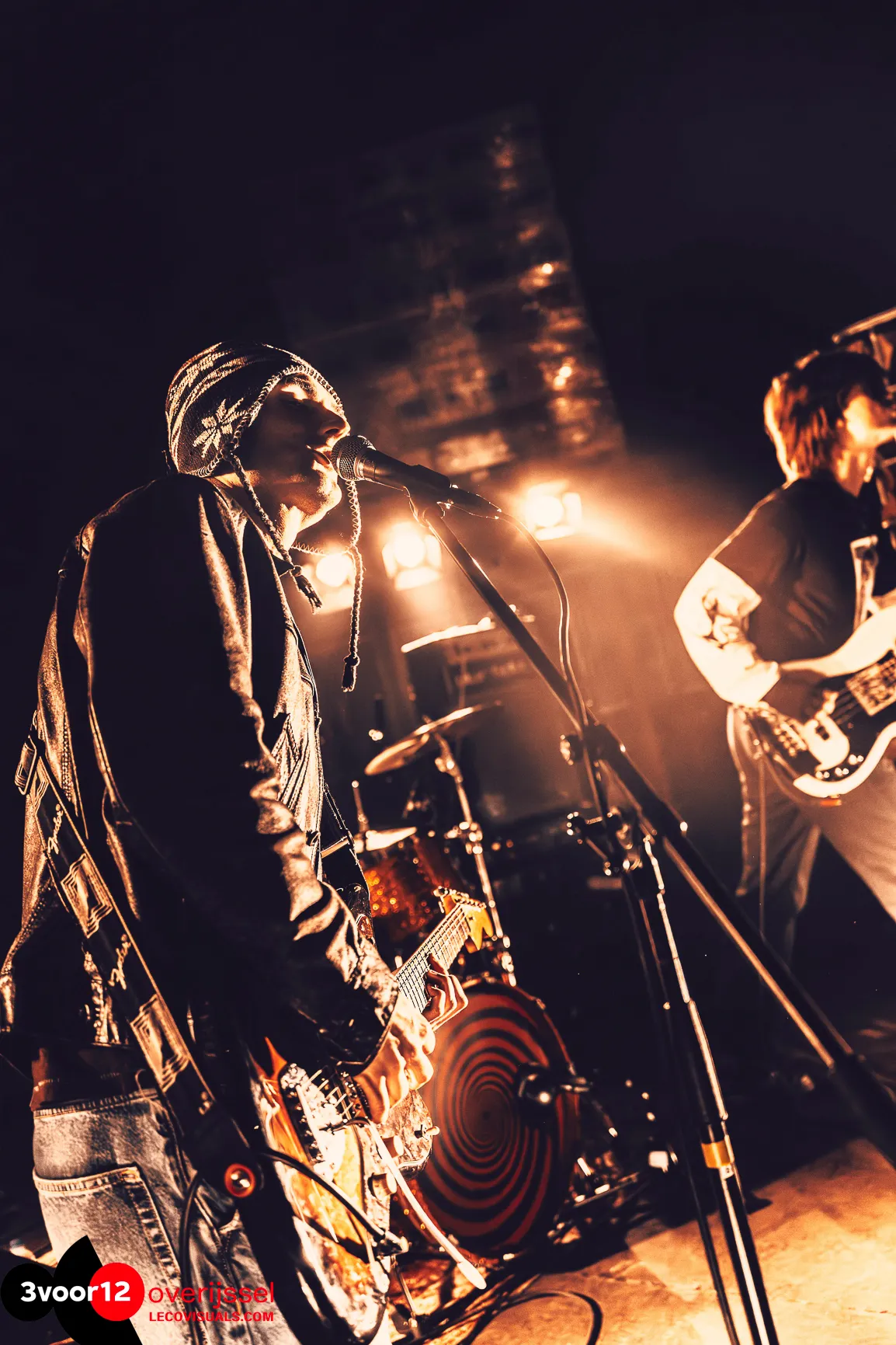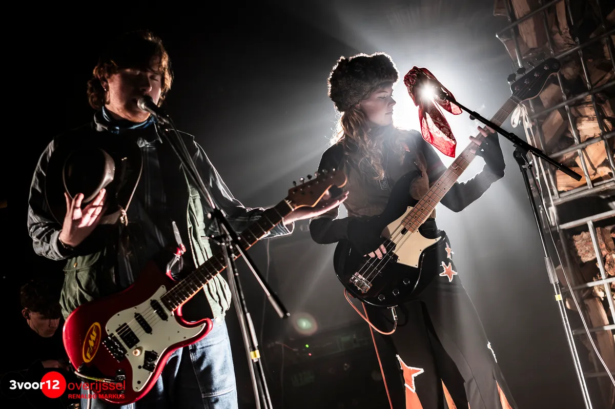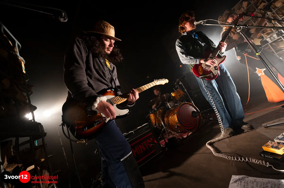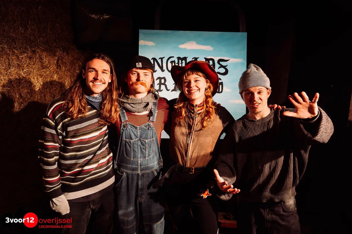 Als laatste is de beurt aan de sleutelfiguren van de avond. Nomads Radio presenteert hun nieuwe EP met overduidelijk speelplezier. Al snel gaan de warme jassen en de handschoenen uit, zowel op het podium als in het publiek. Naast bijna alles van Western Ecstasy komt er ook materiaal langs van de in 2023 uitgebrachte langspeler In a Crack, plus een nog niet eerder vertoonde track die verser dan een dampende oliebol klinkt. Omdat de mondharmonica nog thuis ligt, imiteert drummer Nanne haarfijn a cappella het blaasinstrument voor de intro van Burned Out. Piepjonge teksten worden vooraan meegezongen alsof ze al jaren in de rotatie zitten en er wordt gedanst met een uithoudingsvermogen waar de eigenlijke bewoners van deze stal een puntje aan kunnen zuigen. Na afloop wordt het uitbundige publiek lading voor lading weer netjes naar het station gebracht en keert de rust terug nabij de Duitse grens. Of de paarden jaloers zullen zijn op het feest dat in hun stekkie is gevierd, zullen we nooit weten.
