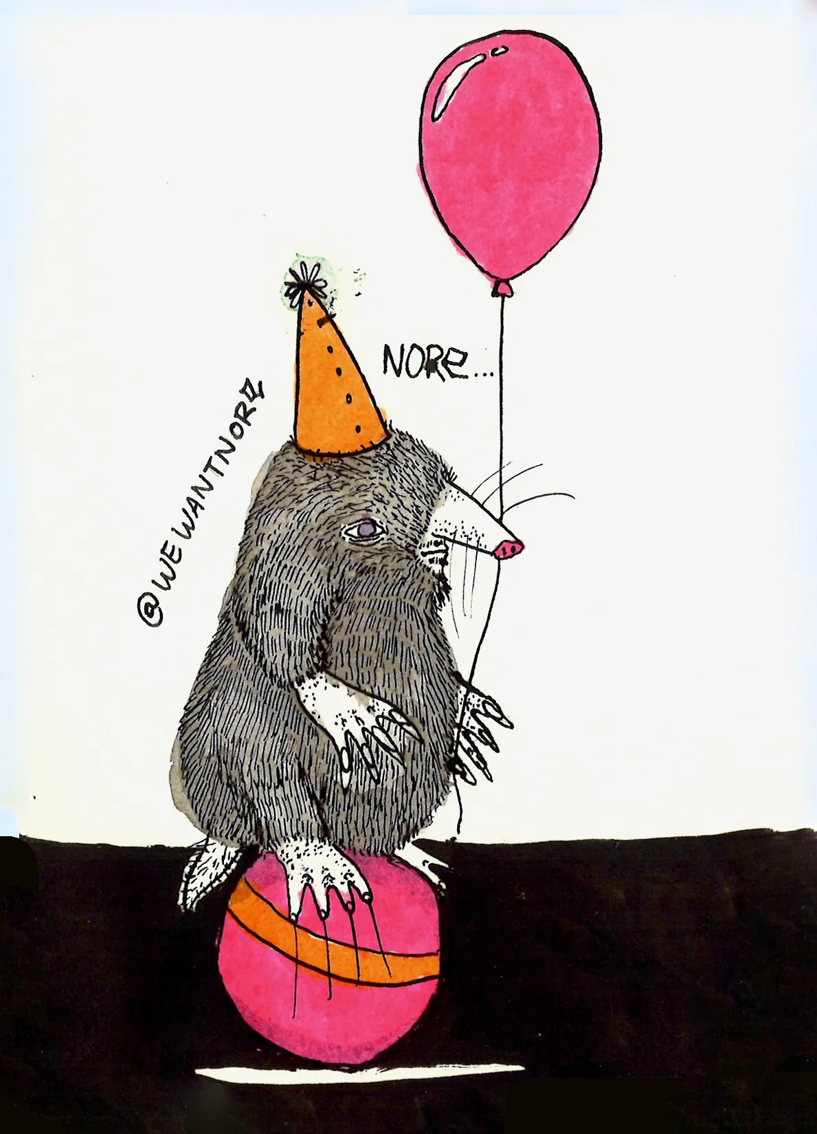 “Ik (Tessa) teken veel, vooral dingen die net zo zijn van ‘Ehhh wat is dit?’. Bijvoorbeeld Fred de Rat (zie foto, red), of Gerben de Egel met een mensenhoofd en van die vieze kinhaartjes. Wat ik teken is niet per se voor NORE, maar als er dan iets is wat bij de band past gebruiken we het daar wel voor. Eerder was ik wel bang dat de muziek en kunst niet bij elkaar zouden passen, maar ik heb er gewoon op gegokt en het is goed uitgepakt. Soms is het echt heel makkelijk, maar de cover van de EP had bijvoorbeeld echt acht versies nodig voordat iedereen het er mee eens was.”