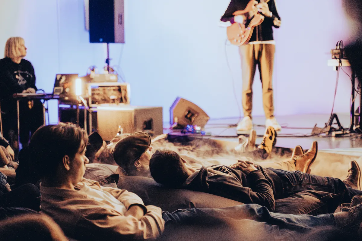 Het publiek dat op deze show is afgekomen is zeer breed, maar echte Roadburners zijn er maar weinig. Voor het publiek zijn er stoelen en zitzakken neergelegd om deze show zo relaxed mogelijk te ervaren. De indeling op het podium doet erg denken aan oud ambient duo Stars of the Lid dat bij hun shows naast elektrische instrumenten ook gebruik maakten van snaarinstrumenten. Bij Ramses3000 zijn dat gitarist Bart van de Sande, die zichzelf niet op de voorgrond plaatst maar Yannick perfect aanvult waar nodig, en cellist Jostijn Ligtvoet, die voor een extra filmische laag zorgt en niet alleen strijkt maar ook speels tokkelt. Als je goed luistert naar de soundscapes hoor je tussendoor vogels fluiten, tikkende klokken en andere natuurgeluiden. De muziek, die zeer minimalistisch is, wordt bijgestaan door hypnotiserende kleurrijke beelden en een geur ontwikkeld door de Tilburgse, jonge geluidskunstenaar Brian Omen wat ervoor zorgt dat de show, zoals beloofd, alle zintuigen prikkelt. De voorstelling duurt exact 40 minuten en is daarmee wel aan de korte kant. We hadden hier nog wel 40 minuten kunnen zitten en nog ontspannender de zaal kunnen verlaten. (MvdH)