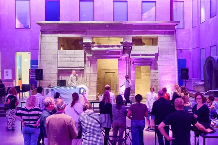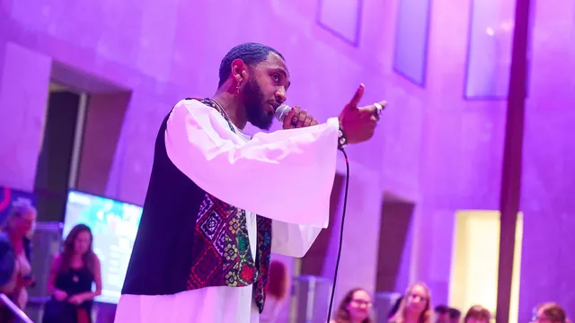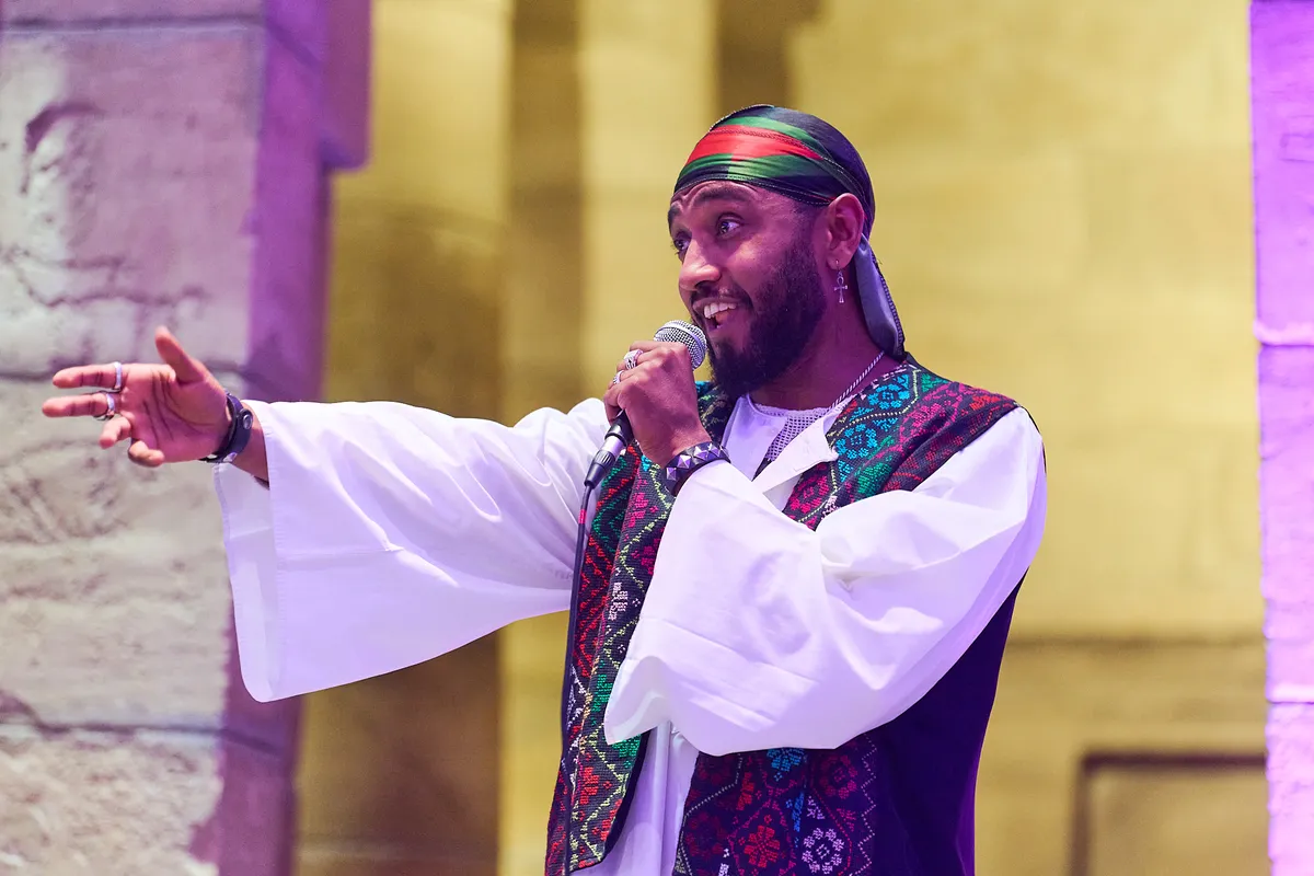 Het Echoes of the Nile Festival is weer terug in het Rijksmuseum van Oudheden, met deze keer een editie die zich focust op Soedan. Knutselworkshops, lezingen, rondleiding die passen bij het Pride-thema van de week, het staat allemaal in het teken van de landen die de Nijl doorkruist. Maar de beste brug tussen het heden, verleden, performance en politiek is het optreden van Razeen deze avond. De Soedanees-Nederlandse multidisciplinaire kunstenaar geeft gehuld in djellaba en durag in de kleur van de Soedanese vlag een betogend en bezield optreden voor de Nubische tempel in de entreehal van het museum. Zang in het Engels, Arabisch en Nederlands, genres die variëren van elektropop tot hiphop, en een dansstijl die een handdruk is tussen de biculturele wortels van de artiest.