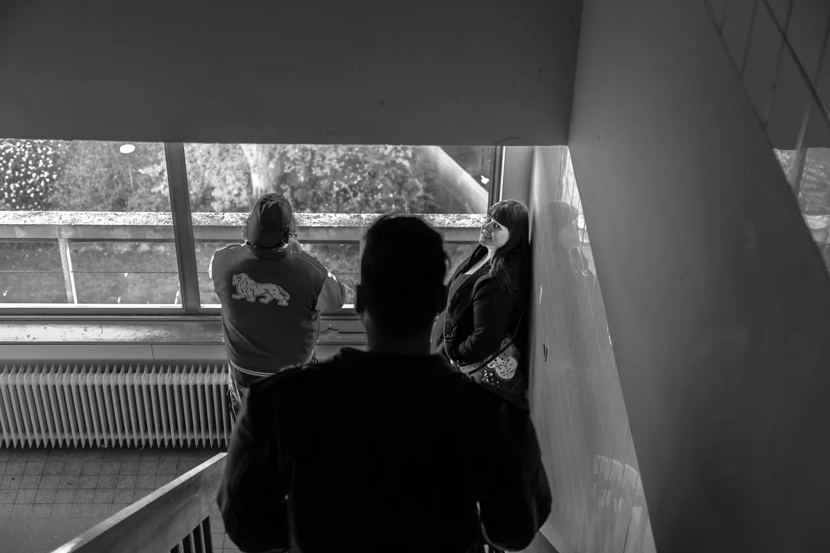 Ondertussen voel ik mijn vingers niet meer van de kou en voelt Sytse naadloos aan dat het weer tijd is om het trappenhuis in te gaan. We dalen met wat omwegen weer af naar beneden, spreken wat bewoners van het pand en fantaseren over oefenruimtes in de kelder en dat een zeker poppodium dat zijn intrek wel kan doen hier. We slaan nog even door in de fantasie - want die kost niks - en bedenken dat er dan ook een hostel kan komen waar bands kunnen overnachten, er kan op de begane grond wel een shoarmazaak komen… Of gewoon in de kantine. Bedenk het maar…