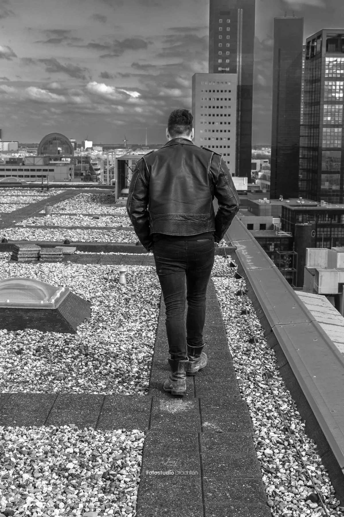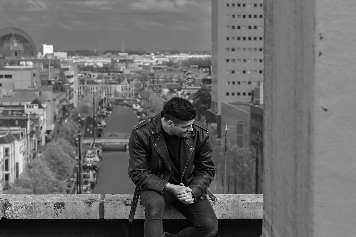 Ik lag wat half op de bank, maar zat binnen een seconde rechtop. “JA! Laten we dat doen. Ik regel dan ook een fotograaf. Ow shit… Kan dat wel? Anderhalve meter, enzo? Nou ja, komt wel goed. Wacht. Ik ben zo bij je terug.” Werkelijk nog geen minuut later heb ik ook een overtuigende ‘ja ik wil’ van fotograaf Jessica. Geregeld. We gaan het dak op. En zo geschiedde. Met een hoop gemopper van mijn kant tijdens het ploeteren op de trap naar de top van het gebouw. De lift doet het niet meer na de brand die een jaar of wat geleden heeft gewoed en ik verkeer niet in de allerbeste conditie.