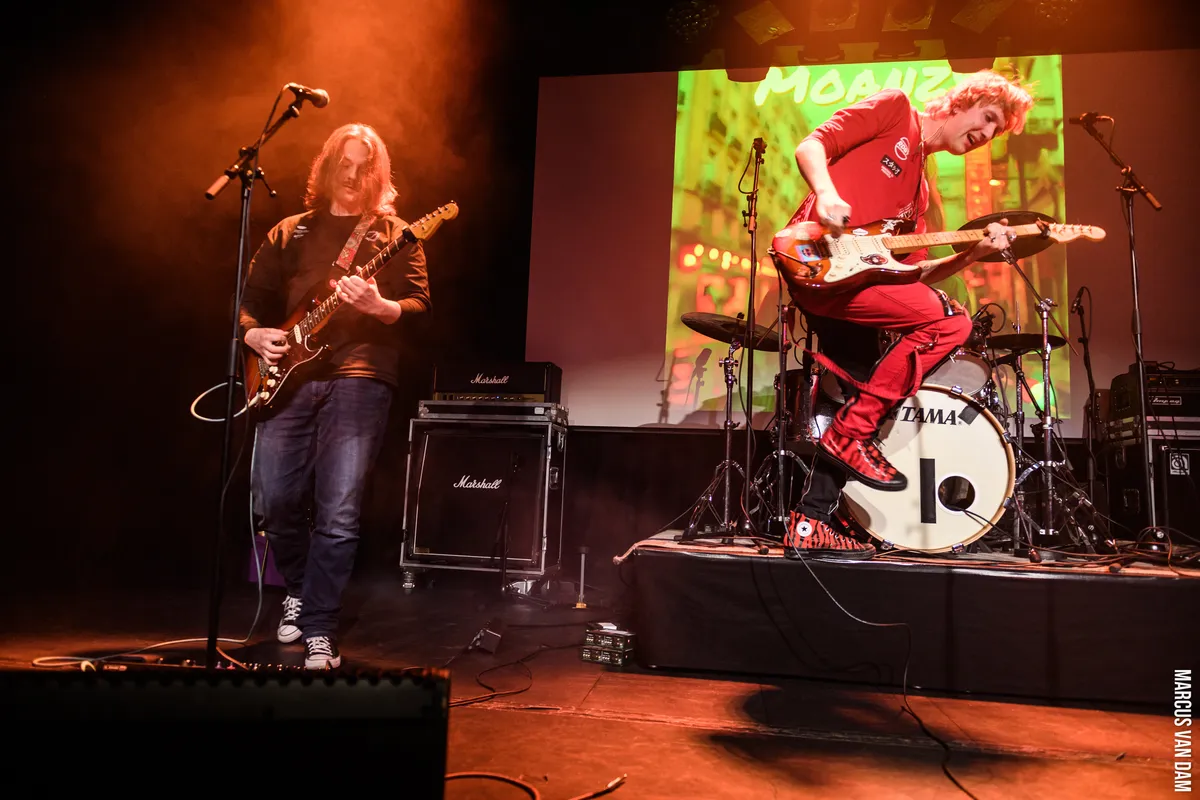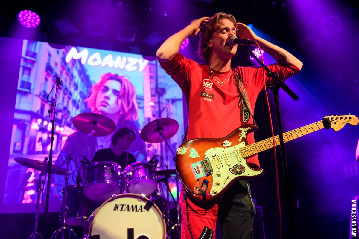 Moanzy is de hele wereld over gegaan met de muziek die hij maakt. Performen is het sleutelwoord. Bij het tweede nummer van zijn set, vraagt Moanzy of er iemand in de zaal een solo kan spelen. Als blijkt dat er iemand een mondharmonica bij zich te hebben, komt deze spontaan het podium op om even solo eruit te gooien, wat binnen het nummer door Moanzy even passend wordt gemaakt. Zijn muziek neigt naar indierock en misschien wel met een wat punkrandje eraan. Het merendeel is stevig werk, hoewel Moanzy toch even ook zijn moment pakt, door zichzelf te begeleiden op de elektrische gitaar, waarbij zijn bandleden aandachtig meeluisteren om vervolgens verder op in te zetten en het nummer tot een dynamisch einde weten te brengen. Met zijn optreden waarbij hij zowel in het Nederlands als in het Engels het publiek benadert, geven hem toch dat hij een man van de wereld is.