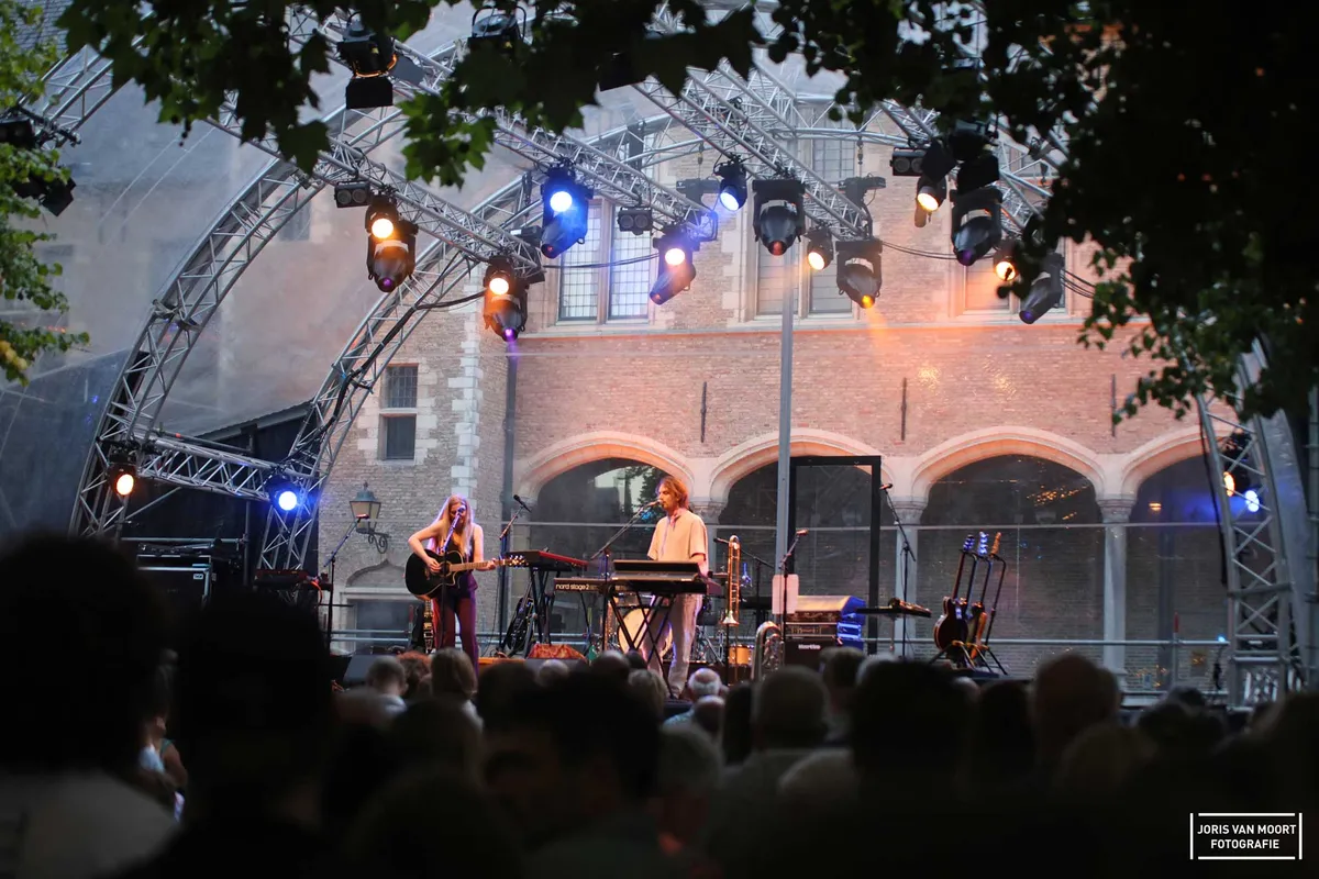 Een zwoele zomeravond, een goed gevuld Abdijplein en de aftrap van de Abdij Zomeravonden met VOS en Spinvis: mooier kun je de week niet beginnen. Presentator Steffen Brinkhaus heet iedereen welkom en moedigt het publiek aan vooral een biertje te halen of een bijdrage te doen via de QR-code. Het plein vult zich gestaag met een mix van nieuwsgierige wandelaars en echte liefhebbers.