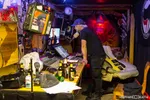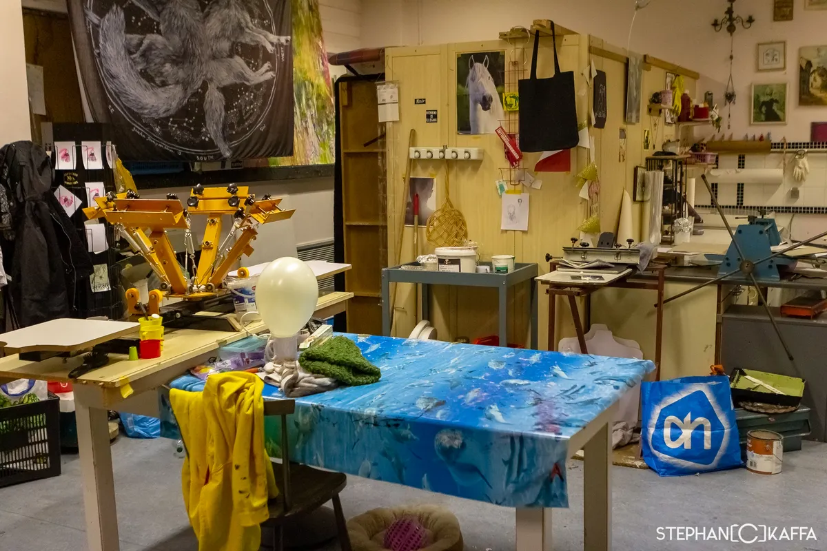 Eli vertelt dat alles onderling gedeeld wordt. "Er is een greenscreen dat iedereen mag gebruiken. Iedereen is heel sociaal met elkaar." Vervolgens lopen we door naar het volgende atelier. "Hier wilde ik een zeefdrukwerkplaats van maken. In de hoek staat de zeefdruk, maar er zijn meerdere mogelijkheden om de ruimte te gebruiken hier." Eli vertelt ons dat de ruimtes door tussen de tien en vijftien mensen gebruikt zijn en dat verschillende acties en bands gebruik hebben gemaakt van de zeefdruk om merchandise te maken. "Daarnaast heb ik een aantal mensen de beginselen van zeefdrukken geleerd. Het is een dure hobby om te zeefdrukken want je hebt heel veel dingen nodig. Hier zijn die spullen gewoon aanwezig." Alle ruimtes zijn semi-openbaar vertelt Eli. "Iedereen kan in principe langskomen als ze een afspraak maken."