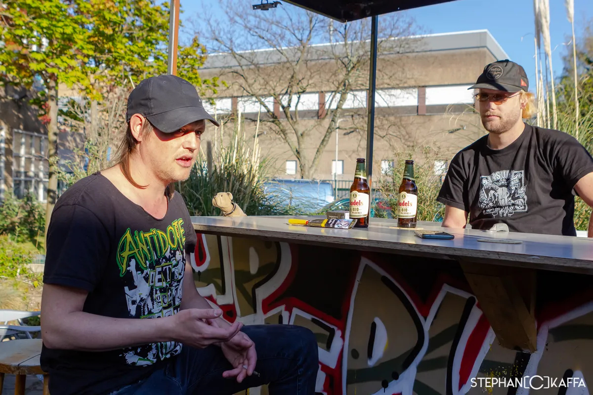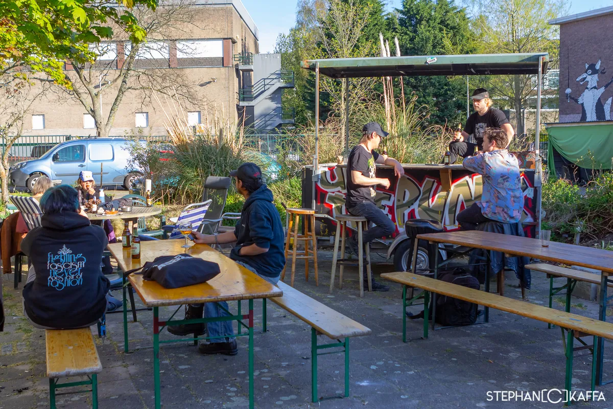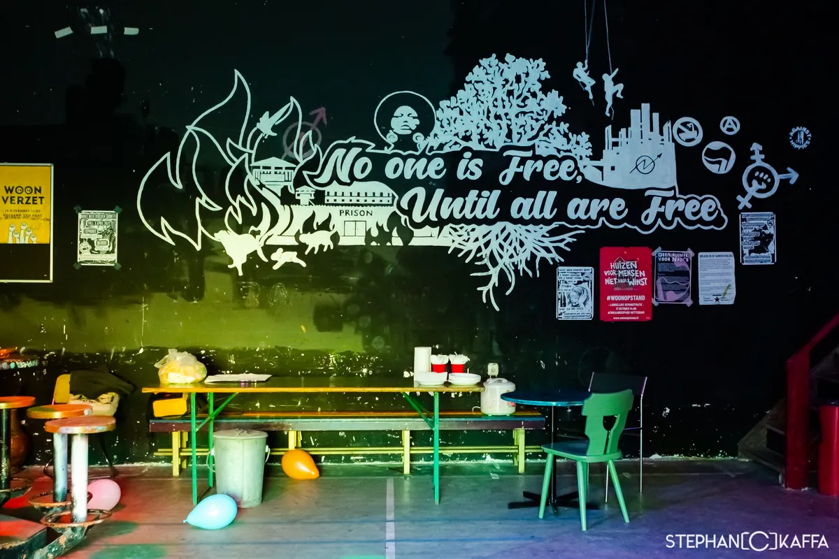 Ons gesprek begint bij de buitenbar. Samenscholingmastodonten Jonne Praat en Quincy Gravestone heten ons welkom, bieden ons een biertje aan en vertellen over hoe De Samenscholing ontstaan is. "De Samenscholing komt voort uit De Vloek. Dat was een vrijplaats die gekraakt heeft gezeten op Scheveningen.", begint Jonne. "Als je verder terug zou gaan zou je De Blauwe Aanslag kunnen noemen als ultiem beginpunt. Dat was een van de grootste kraakpanden in Nederland maar dat werd in 2003 ontruimd." Na de ontruiming van De Blauwe Aanslag heeft een deel van de bewoners een pand op de Waldeck Pyrmontkade gekocht. Een ander deel trok naar De Vloek, zo ook Jonne. "In dat pand hebben we onder andere feestjes gegeven, concerten georganiseerd en het eetcafé Water & Brood gehouden. Maar in 2014 kregen we te horen dat we ook hier weg moesten."