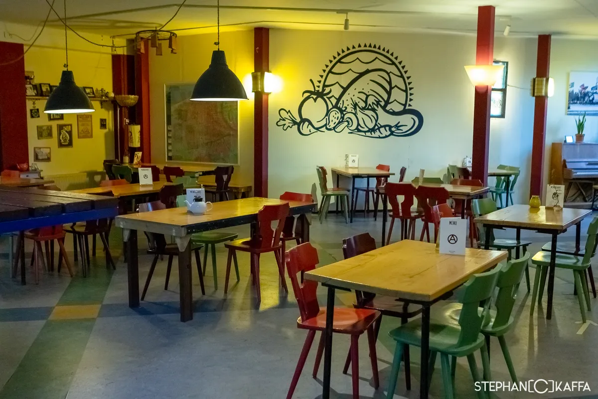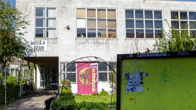 Tijdens ons bezoek aan De Samenscholing kunnen we het niet laten om ook een maaltijd te nuttigen in het veganistische restaurant Water en Brood. Een lekkere en voedzame driegangenmaaltijd wordt ons voorgeschoteld voor een heel klein bedrag. We spreken Kiki die het restaurant beheert. "In De Blauwe Aanslag is Water en Brood ontstaan als een volkskeukentje. Dit groeide later door naar een eetcafé in De Vloek en daarvandaan is het naar De Samenscholing gegaan." In de keuken staan vrijwilligers die al een tijdje meedraaien bij De Samenscholing. Het gedachtengoed van de broedplaats is goed merkbaar in het restaurant. "We willen een lekkere, veganistische en biologische maaltijd aanbieden voor een lage prijs. We hebben zelfs een actie waarbij mensen een maaltijd voor een ander kunnen kopen." We vragen Kiki hoeveel gasten er op een avond zijn. "Dat weet ik niet precies, maar het bezoekersaantal schommelt een beetje tussen de twintig en dertig mensen per avond. Voor de pandemie waren dat er nog meer. Ik denk dat we toch wel populair zijn gebleven omdat we, naar mijn weten, het oudste veganistische en biologische restaurant van Den Haag en omstreken zijn. Daarnaast is veganisme en biologisch eten heel hip geworden, ondanks dat zijn wij heel erg onszelf gebleven."