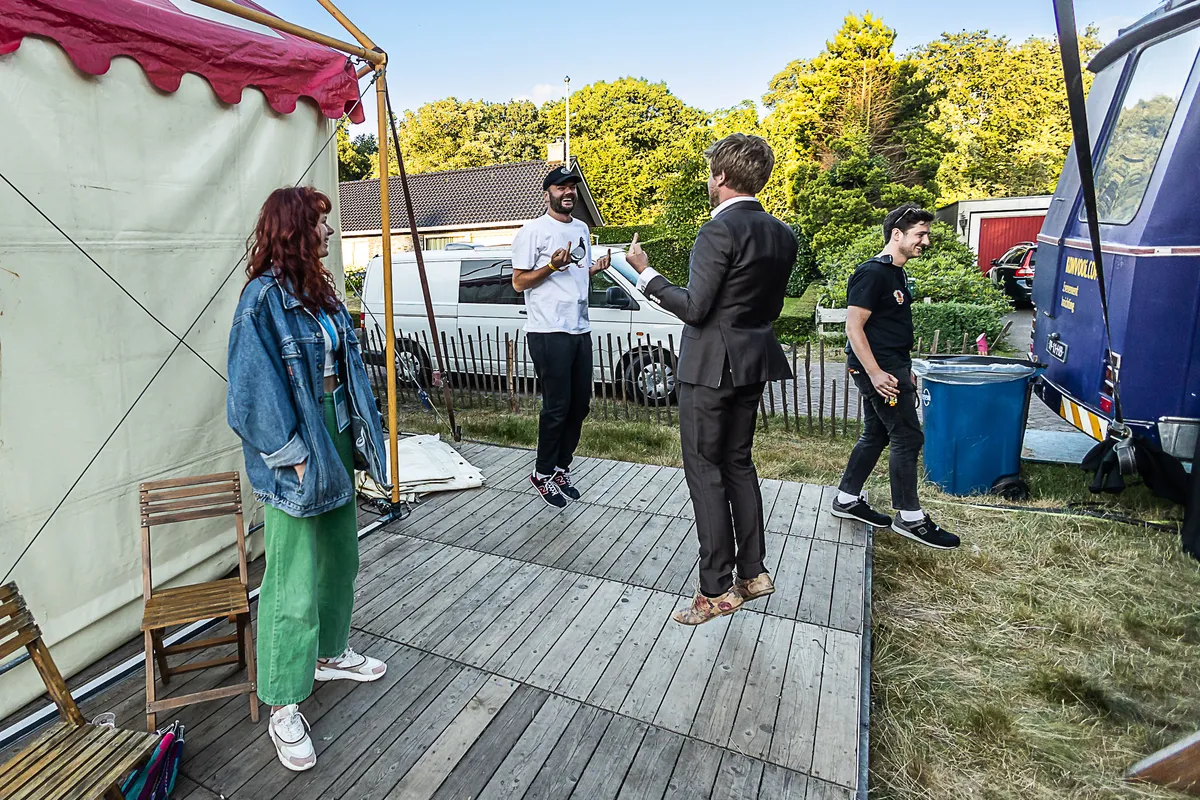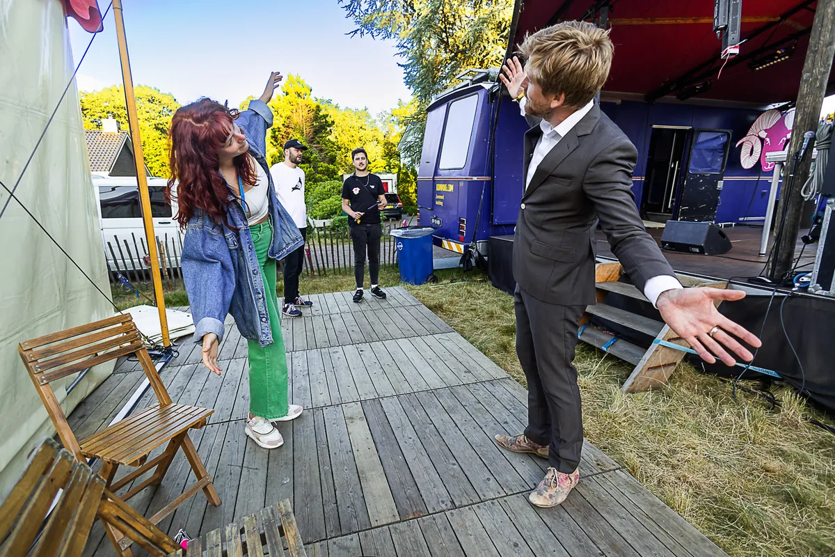 In de uren die volgen begrijp ik steeds beter het gebruik van de bijnamen. Hoeverloo vertelt met een lieve, ietwat verlegen blik in zijn ogen over zijn favoriete artiesten. Als mijn collega zijn camera op hem richt, zwaait hij hier wat ongemakkelijk naar. Maar zodra hij zijn nette pak aantrekt en het podium opstapt, verandert hij in ‘Hans Hoeverloo’, een extraverte artiest die ongegeneerd zijn dansmoves showt. Nog voordat de soundcheck begonnen is, gaat hij in zijn eentje helemaal los. Een paar meisjes lopen giechelend langs. ‘Ik hoop dat het publiek ook een beetje wil dansen straks!’ zegt hij. Ik kijk vertwijfeld naar de mensen die rondlopen op het festival. Het is niet het publiek waarvan ik verwacht dat ze straks in het rond staan te springen.