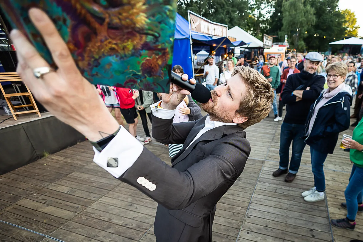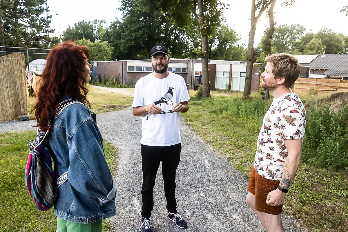 Ik blijk het helemaal bij het verkeerde eind te hebben. Hans Hoeverloo en De Ridderbaas geven blijk van een enorm levendige dynamiek en het kost ze niet veel moeite om het publiek, dat eerst nog van een afstandje staat te kijken, in hun ban te krijgen. Een halve cirkel wordt om het podium heen gevormd, waar De Ridderbaas in zijn duivenshirt strakke elektrobeats produceert. Zijn wederhelft staat binnen de halve cirkel die gevormd is, in een net pak gekleed, vol overtuiging zijn meeslepende, poëtische teksten voor te dragen uit een notitieboekje.