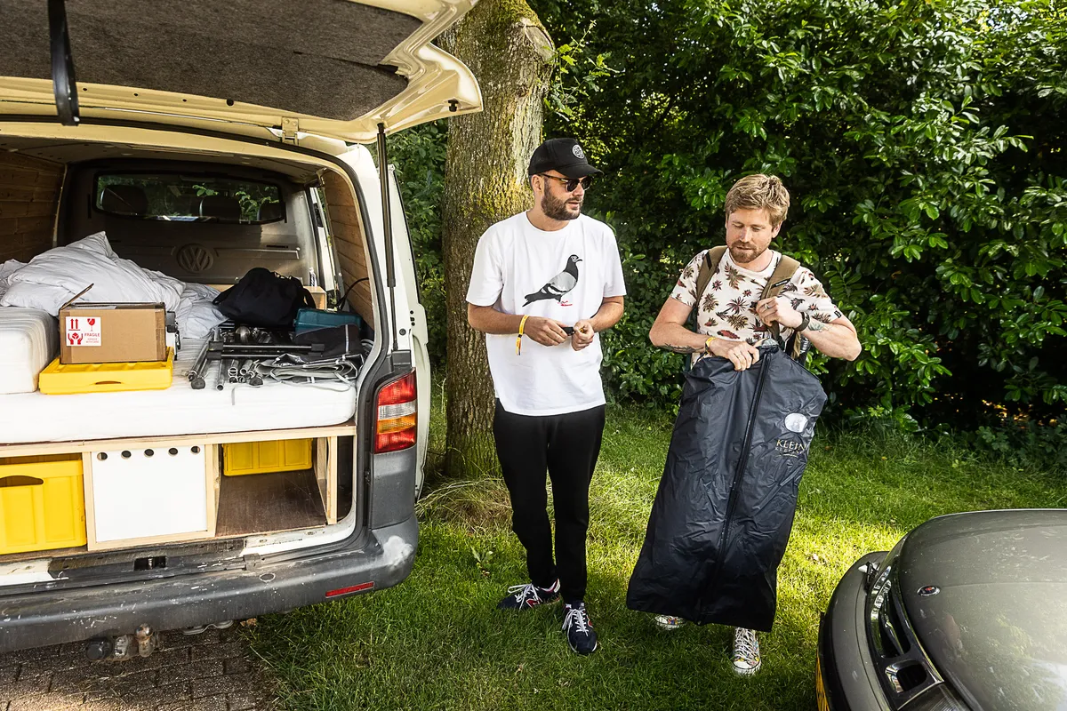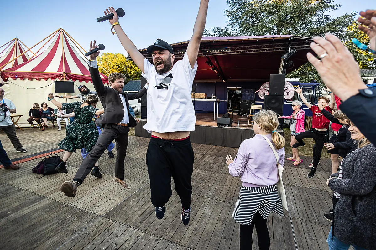 Ondertussen dansen en springen de twee over het podium en het veld heen. Eerder vertelde De Ridderbaas me dat ze het leuk vinden om het publiek bij hun optreden te betrekken. ‘Vooral mensen die een beetje voor zich uit staan te dromen’, zei hij tegen me. En inderdaad, meerdere malen zoeken ze de nabijheid op van een (vaak vrouwelijke) toeschouwer en spreken en zingen ze deze toe terwijl ze diep oogcontact aanhouden. Het roept ongemakkelijke lachjes op, en een aanhoudende spanning en levendigheid binnen het publiek. De mannen leren het publiek aanstekelijke dancemoves als ‘de crosstrainer’ en sporen aan om de controle te verliezen. Dat blijkt succesvol!