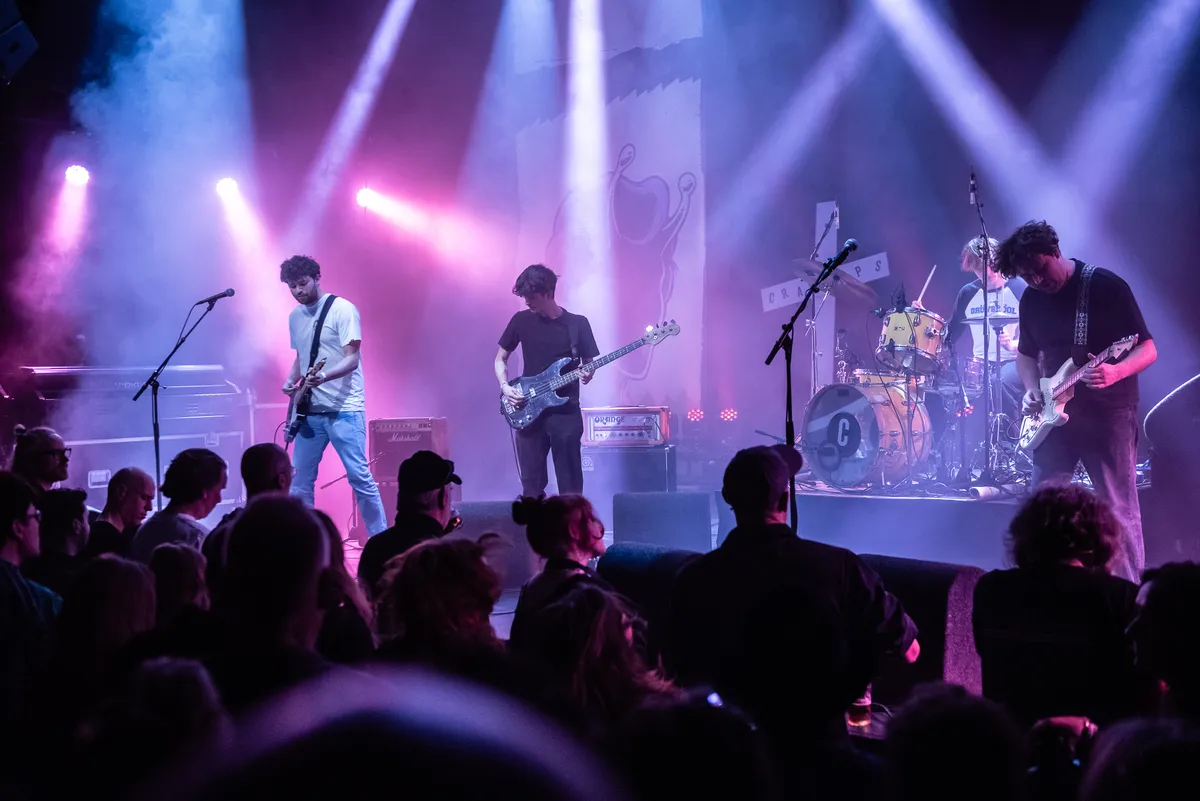Op de schuine dwarsbalk van een wit, kartonnen, kruis staat de bandnaam: CRACKUPS. De vier bandleden komen op in jeans en t-shirts zonder enige opdruk. Geen opsmuk daar. Contact met de zaal is al even bondig: “Hoi”, horen we nog net voordat de snaren van drum en gitaren oerend hard gaan.
