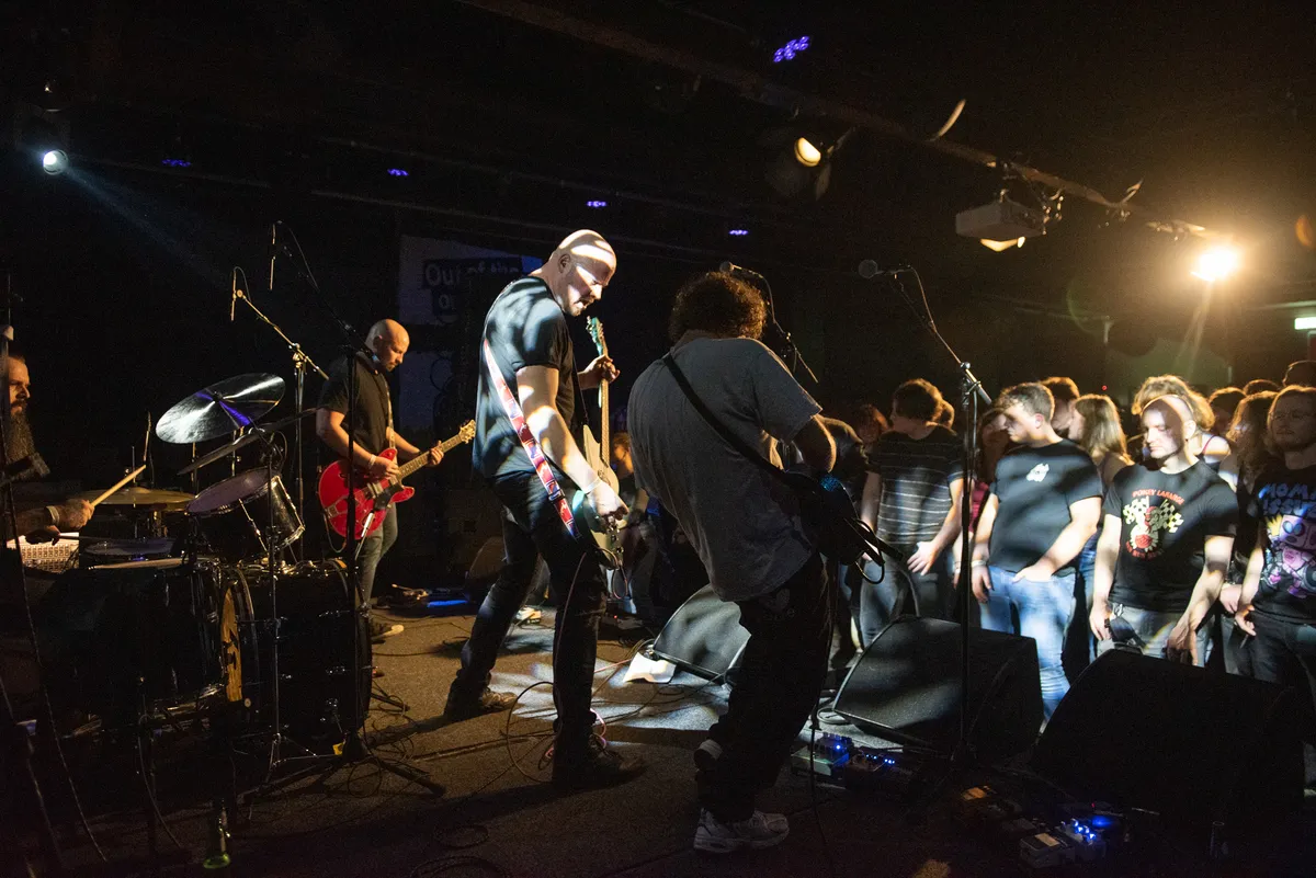 Dat is zonde, want het Marathongeluid klinkt echt geweldig. Hun set opent met het kerkgezang van de postpunktopper ‘Out of Depth’. Hun drie grommende gitaren zorgen voor spanning, een gevoel alsof er elk moment iets vreselijks zou kunnen gebeuren. Na een kwartiertje soleert zessnaren-bassist Nina Lijzenga met een soort zandstormdistortion. Ondanks een lager volume rockt Marathon harder dan vrijwel alle rockbands. De schim van leadzanger Kay Koopmans springt ook in het rond, tot wel vijfenzeventig centimeter hoog.