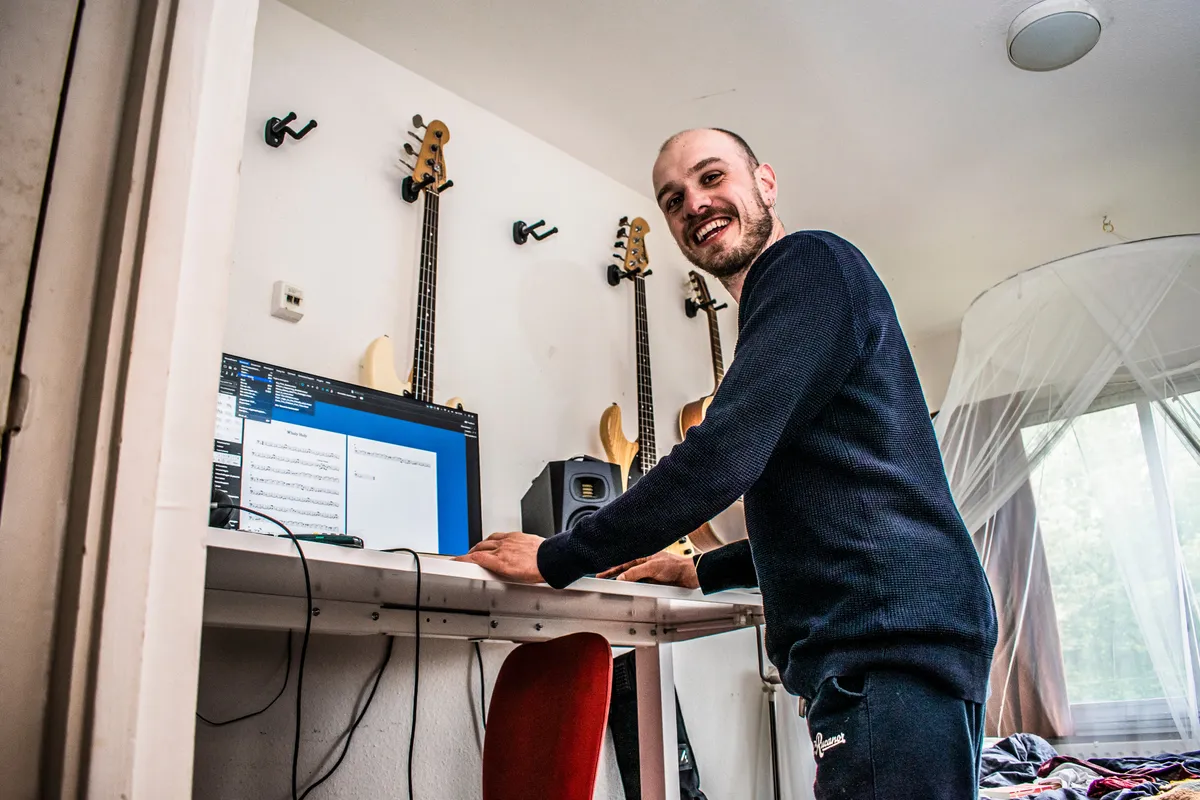 We vervolgen onze weg terug de gang in en nemen de afslag van gitarist Luc. Hier vinden we geen basgitaar, maar een gitaar aan de muur, vintage opnamemateriaal en zoal een bank en bed. Luc is op zijn tiende begonnen met gitaarspelen, heeft het conservatorium afgerond als jazzgitarist en produceert zijn eigen liedjes. “Vanaf mijn achttiende heb ik veel muziek geproduceerd, maar niet per se uitgebracht”. Bram gaat er tegenin en Luc blijkt zoal een ep met de band Pony Machine te hebben uitgebracht. “Ik heb recentelijk ook twee gitaar albums uitgebracht onder de naam Sunday Guitar”, zegt Luc, “daar ben ik in de lockdown mee begonnen. Ik zat zoveel op mijn kamer met mijn gitaar. Ik zit altijd overal te spelen, en op gegeven moment zei iemand je moet het gewoon uitbrengen en opnemen, want het is gewoon ‘nice’. Dat ben ik toen gaan doen.” Luc vervolgt; “Meer muziek dan ik ooit heb uitgebracht. Het is gewoon makkelijk, in ieder geval als gitarist om één gitaar te hebben, zoals ik had bij Sunday Guitar. Dat is dan super duidelijk. Dan hoef je ook niet na te denken over andere partijen, en geen zware overwegingen te maken.”