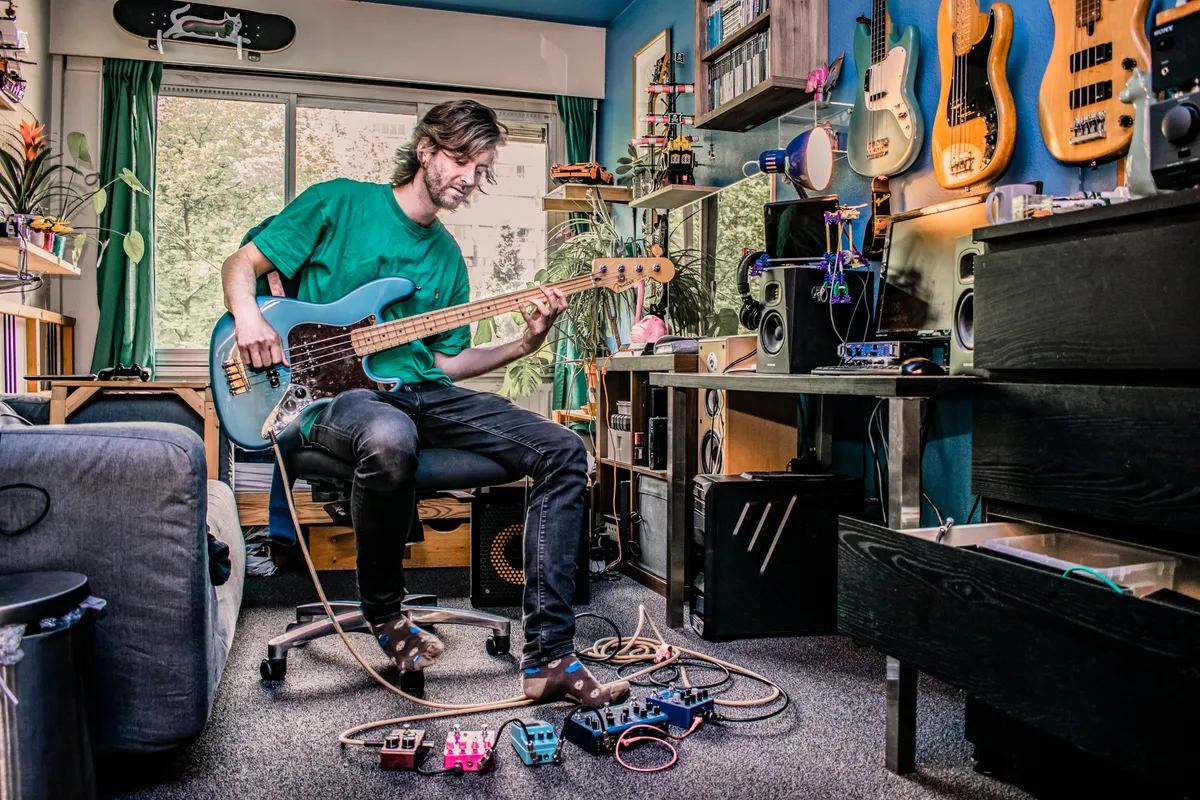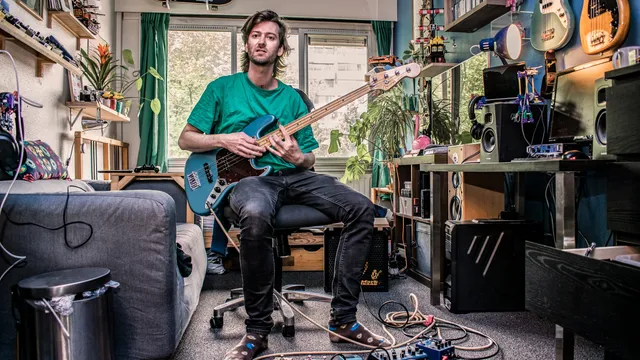 Nogmaals terug de gang in nemen we de laatste afslag, die van Reindert. Reindert: “Ik ben net als Bram bassist en Luc en ik hebben samen een master op het conservatorium doorgelopen. Ik heb een band genaamd Kruidkoek, daarmee hadden we in februari net een album gereleased in het Bimhuis. Dat was hartstikke leuk en het ging boven verwachting goed, maar een week later ging alles op slot. Eigenlijk vond ik dat heel chill. Ik heb een jaar zoveel gechillt en voor mijzelf gestudeerd. Toen het stof een beetje was neergedaald ben ik ook juist met die bands gaan schrijven, en heb ik nieuwe projecten opgezet. Hier en daar wat geld aangevraagd, om plaatjes op te nemen en een nieuw project gestart met een zangeres. Dat heet Blue Sands met Esther van Hees, een Vlaamse jazz zangeres. Daar ben ik als bassist zegmaar het instrument van het duo, en zij zingt. Ik zit dus gewoon allemaal belachelijke dingen te studeren, en gitaarliedjes te vertalen naar alleen een basgitaar. Ik heb heel veel effectpedalen gekocht. Ik heb mijn bas omgestemd naar een cello zodat ik Bach kon oefenen op een onconventionele manier.” Bram, bij de deuropening, komt ertussen en zegt; “NERD!”. In de kamer van Reindert liggen inderdaad de pedalen verspreid over de grond, ook hier hangen basgitaren aan de muur maar ook een skateboard, cd’s, planten, en meer.