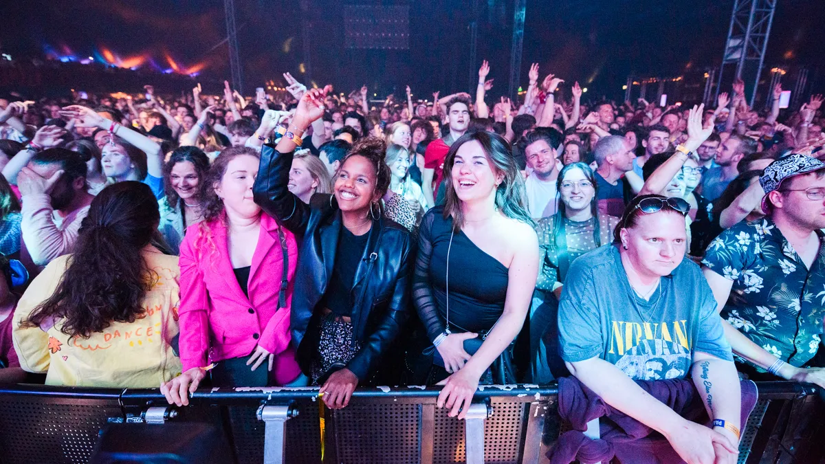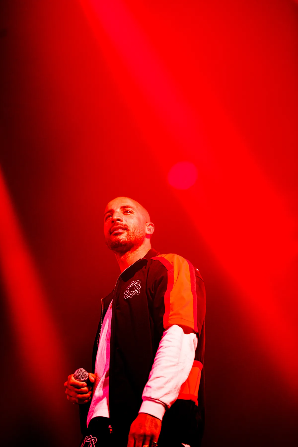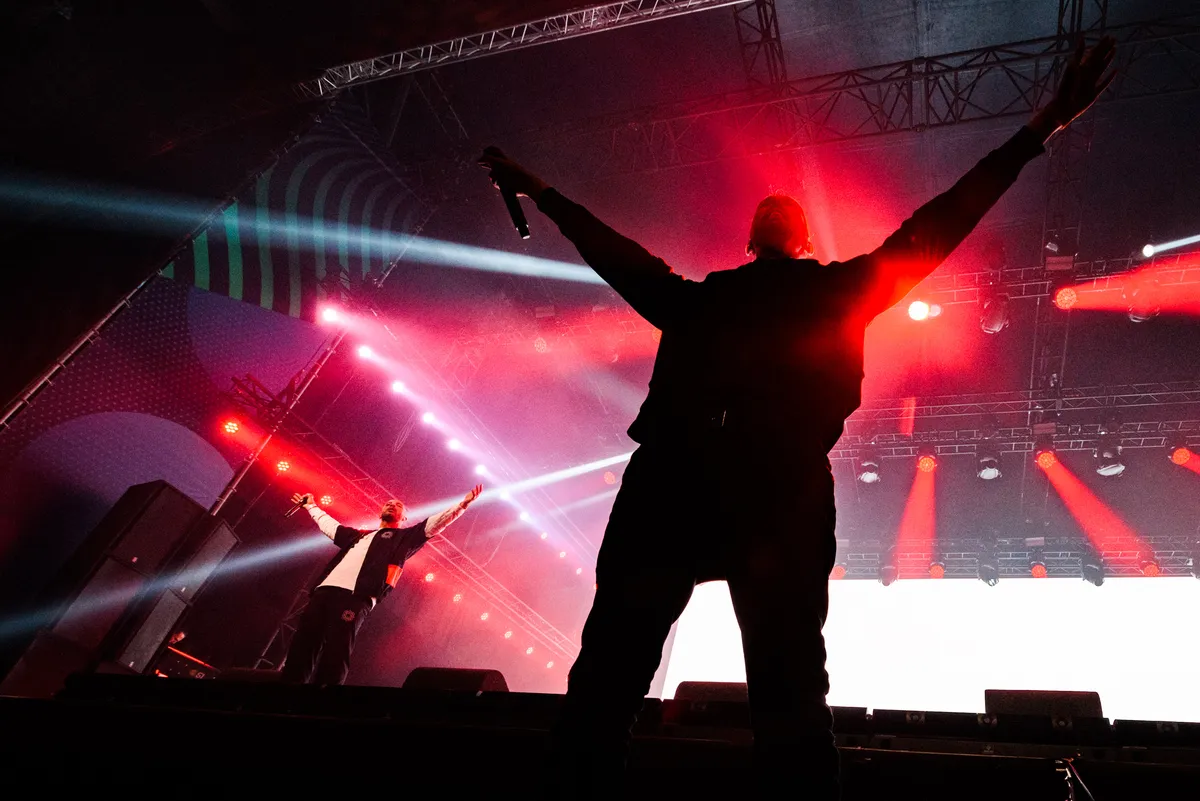 Het is dan ook een fantastisch ratjetoe van mensen in een uitpuilende Apollo. Twintigers staan zij aan zij met mensen twee keer zo oud als hen. Er zijn heads, rockers en dance-liefhebbers. The Opposites verenigt ze allemaal en kan meteen op hard gejuich rekenen bij ‘Droom, Denk, Doe’. Een plaat die hun tijdloosheid aantoont, want met die alles verzengende synthesizers en retro-beats zou het bijna tien jaar oude nummer tussen singles van Dua Lipa en The Weeknd niet misstaan. Het teruggrijpen naar klanken uit bijna-vervlogen tijden wordt ook nog eens visueel uitmuntend ondersteund door de schermen ernaast. Vooraf opgenomen en live-beelden worden door een LSD-filter gegooid en ook de smakelijke 90’s-ravevisuals passen perfect bij de set die verder gaat in ‘Me Nikes’.