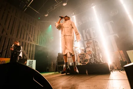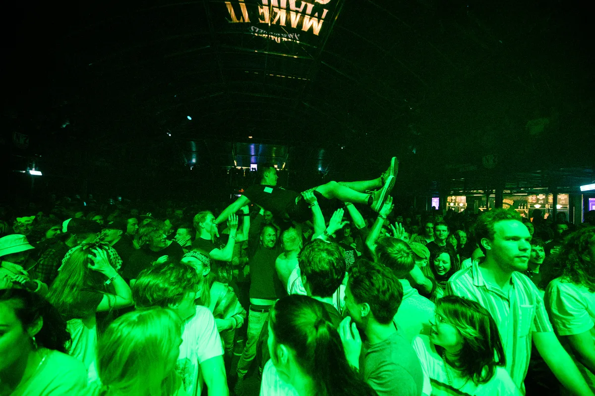 Bierdouches, moshpits en crowdsurfers in overvloed: zoals het een stevige punkact betaamt gaat de boel goed los bij Hang Youth. De band staat bekend om de extreem korte nummers van minder dan een minuut en titels in kapitalen. Dat is ook precies wat we krijgen, inclusief die kapitalen. Gefront door Abel van Gijlswijk, getooid in een soort lange hoodie/jurk, speelt de band vijf a4'tjes aan setlist in zo'n veertig minuten tijd. De droogheid spat ervan af: "Gefeliciteerd met Jezus ofzo", roept hij halverwege de set. Hoewel de zang vaak niet te verstaan is, is de boodschap duidelijk: weg met die gevestigde orde. Op de vloer: rondrennende, moshpittende, biergooiende fans, met her en der een crowdsurfer.