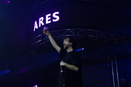 Ares is volgens de Griekse mythologie de God van oorlog en personificatie van de krijgslust. Dat mag dan wel zo zijn, maar de artiest Ares is de nederige gast die in tien jaar tijd uitgroeide tot een van 's lands populairste rappers. Met zijn laatste album Wavyman - Live From Mars brengt hij wederom een unieke hiphopsound vol futuristische en meeslepende elementen. De tracks van dit album laat hij met trots horen aan zijn achterban, waarvan er vanmiddag veel aanwezig zijn in de Roxy. Tot 2017 had Ares een contract bij platenlabel Top Notch, inmiddels is hij independent met zijn eigen label 162records. 162 doelt op Oosterhout, daar liggen de rapper zijn roots. Het logo van het platenlabel staat voor op de draaitafel, waar zoals gebruikelijk Dennis ‘Skiba’ Westerhout staat, goede vriend en producer van bijna alles wat Ares uitbrengt.