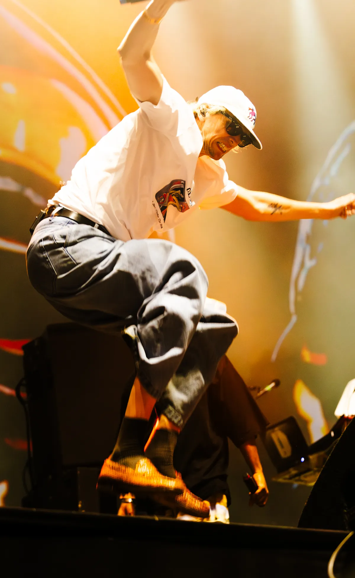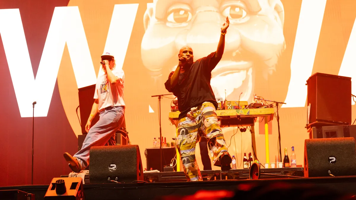 Dat het niet altijd meer vanzelf gaat, zagen we al op Paaspop 2024, toen de show behoorlijk laks aanvoelde. Die herinnering hangt nog een beetje in de lucht wanneer de set vandaag begint. Opener ‘Werkstage’ is net geen binnenkomer van het kaliber dat je nodig hebt om zo’n tent direct op scherp te zetten, en de reactie uit het publiek blijft ook wat lauw. Toch ligt het dit keer niet aan de groep zelf. Faberyayo stuitert over het podium alsof hij de knieën van een twintiger heeft, terwijl Vjeze Fur en Willie Wartaal iets meer in hun kenmerkende laidback flow blijven hangen. Maar ook bij hen is het zichtbaar: ze hebben er zin in. En die relaxte houding is natuurlijk óók gewoon onderdeel van de Jeugd-formule.