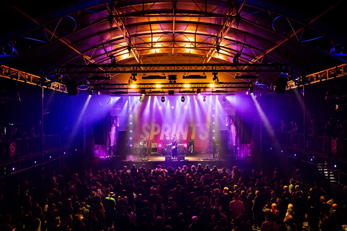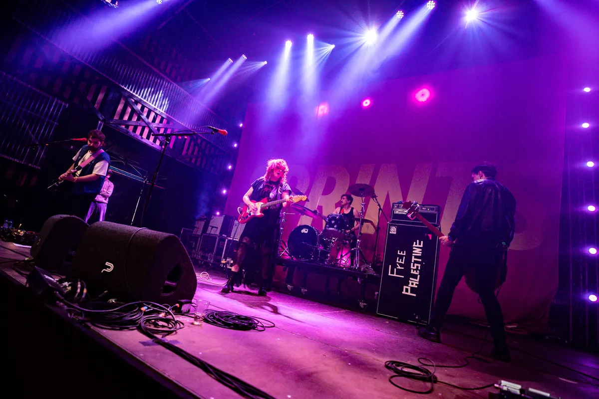Deze Ierse garagepunkband heeft dan wel een enorm roze doek met hun bandnaam erop, een fiere frontvrouw die wat te zeggen heeft en een helder politieke boodschap, maar daarmee is eigenlijk alles wel gezegd. Door de slepende ritmes die terugkomen in elk nummer is er niet veel dynamiek te vinden in het optreden van SPRINTS. Dat is jammer, want potentie heeft de band uit Dublin zeker.
