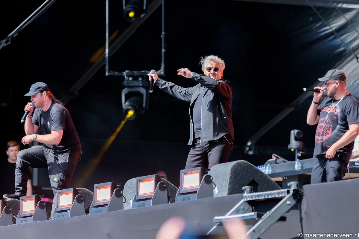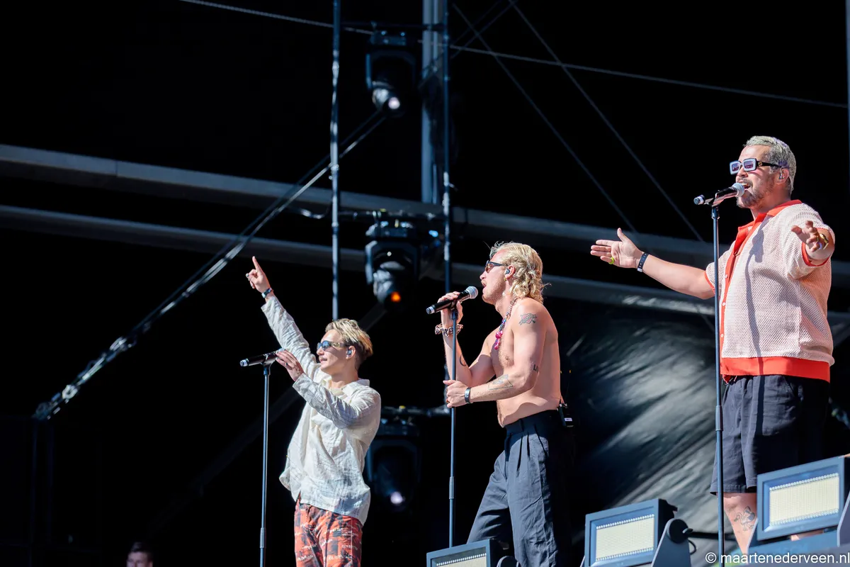 De mannen zetten een feestje neer en het publiek doet trouw mee. Tot ver op het veld wordt meegezongen met 'Alles Kapot' en zelfs de kids op de schouders van paps en mams zingen mee. Bij Haags anthem 'Mijn Stad' ontploft het veld, waarna de boys hun optreden met het nostalgische 'Witte Was' afsluiten.