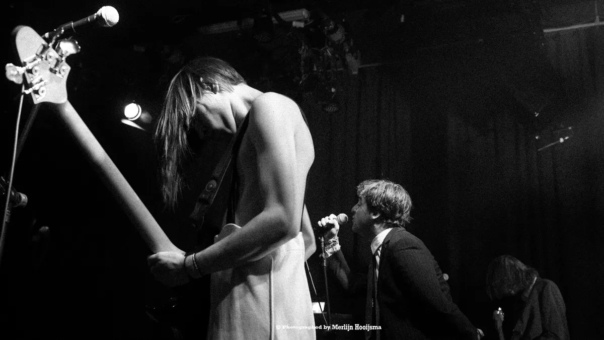 De laatste band van de avond begon rustig op het podium te komen: Queen's Pleasure. Eerst de ontblote gitarist en daarna de rest van de band in een pak. Alsof ze net van hun studentenvereniging borrel kwamen. De zanger loopt ijsberend om de microfoon heen en het publiek wacht gespannen tot de eerste zin door de microfoon klinkt. Het eerste nummer: ‘Niels’ is lekker pakkend met een mooie pauze tussen de luide instrumenten en de tekst ‘’you’re fucking crazy’’.