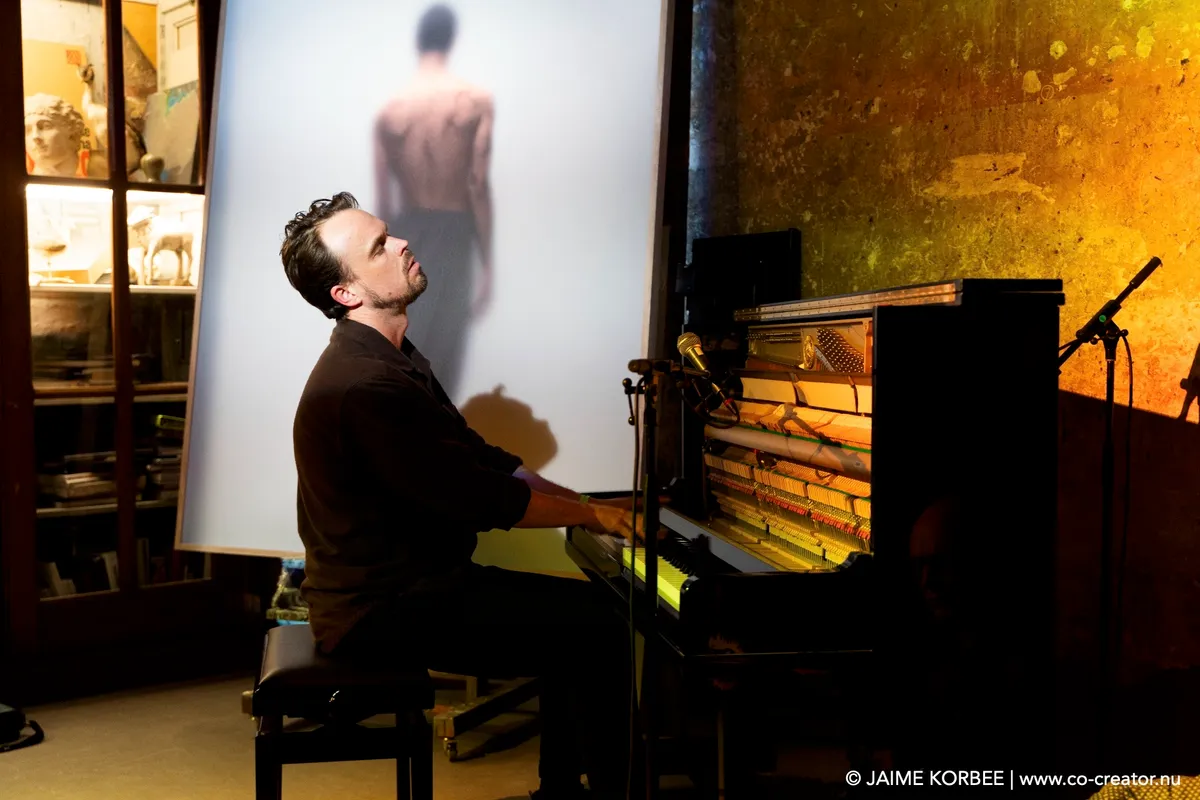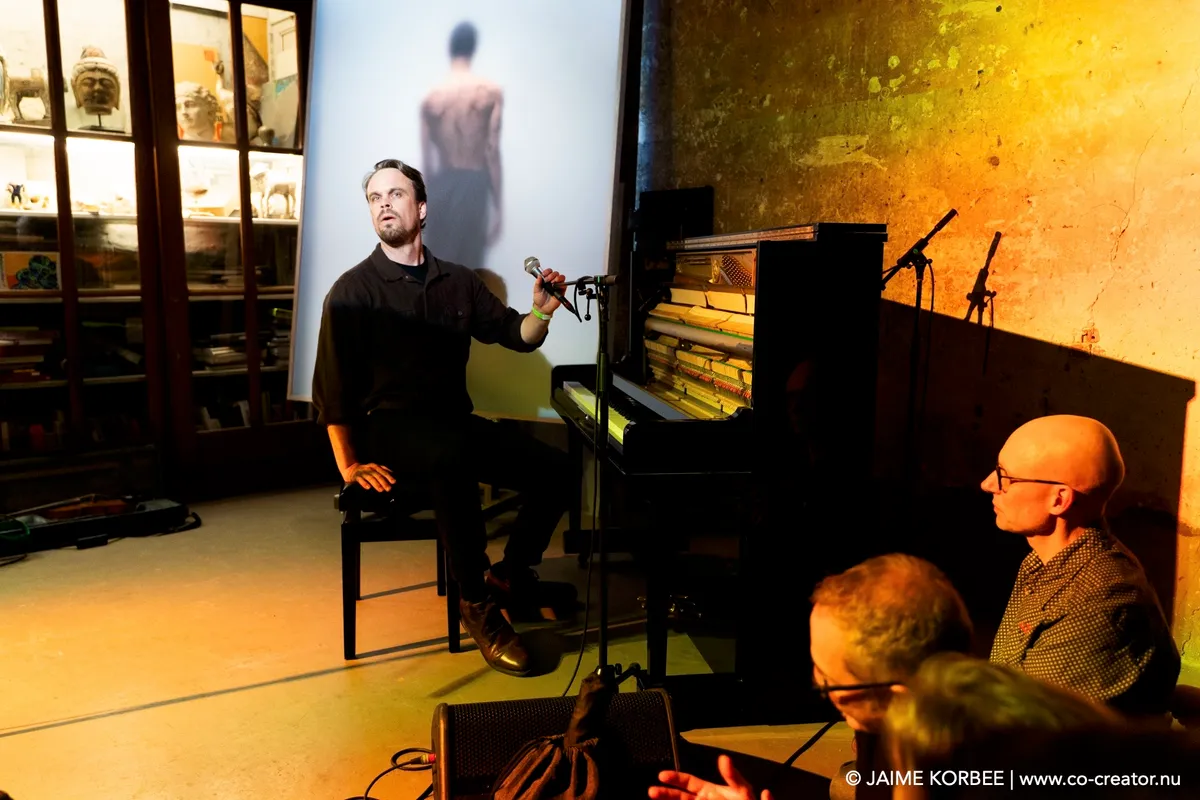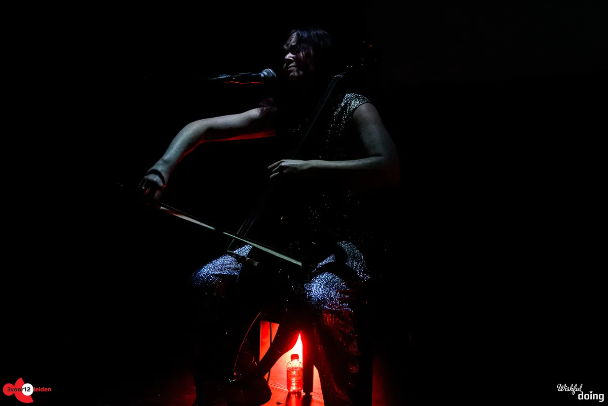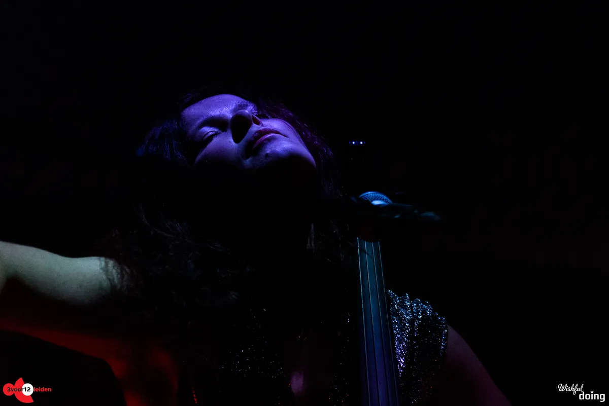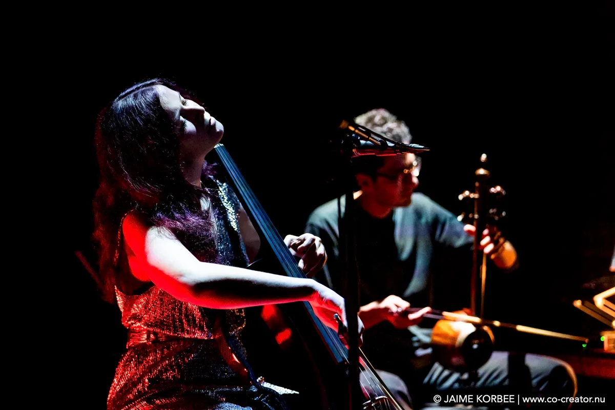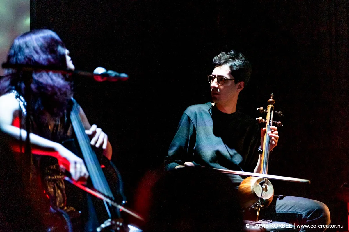 Met duistere, ambient-achtige drones brengen Maya Fridman en Soheil Shayesteh een moment van verstilling op deze muzikale ontdekkingsreis. Soms wordt het zelfs zó stil in de kleine zaal van de Nobel, dat je de muziek uit de grote zaal kunt horen. Het duo is hier op uitnodiging van de Academy of Creative and Performing Arts (ACPA) van de Universiteit Leiden, die elk jaar een verrassende act voor het festival selecteert. In hun project ‘the Power of indifference’ mengen Maya en Soheil invloeden uit de traditionele Perzische muziek en hedendaagse klassieke muziek met experimentele elektronica. Ze spelen nummers van het album dat Maya vorig jaar uitbracht met dezelfde titel, aangevuld met improvisaties. Maya speelt vol overgave op haar elektrische cello, met haar hoofd naar achteren of geconcentreerd op haar cello gericht. Haar zangpartijen, waarbij ze wel de zaal in kijkt, klinken engelachtig. Soheil bespeelt de kamancheh, een snaarinstrument dat zijn oorsprong vindt in het oude Perzië. Daarnaast bedient hij, met handen en voeten, een scala aan elektronica. Een scherm achter de twee muzikanten toont visuals die doen denken aan water en vuur, als beeldende ondersteuning bij het muzikale universum dat de twee jonge muzikanten neerzetten. Verder is het donker in de zaal, wat het geheel een wat gothic-achtige uitstraling geeft. In de sacrale sfeer van die schaarse verlichting luistert het publiek ademloos.