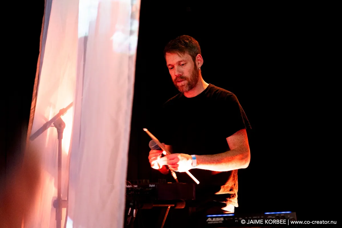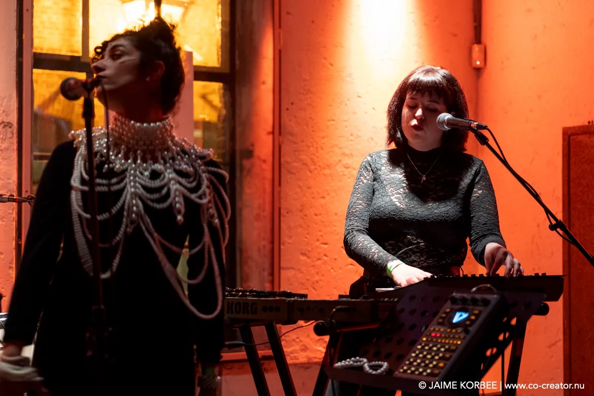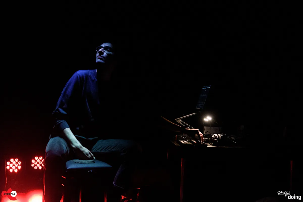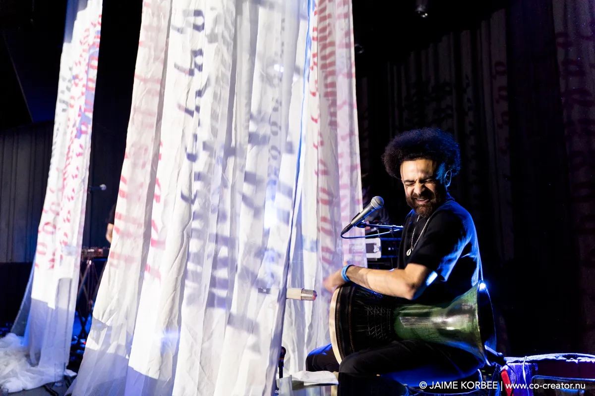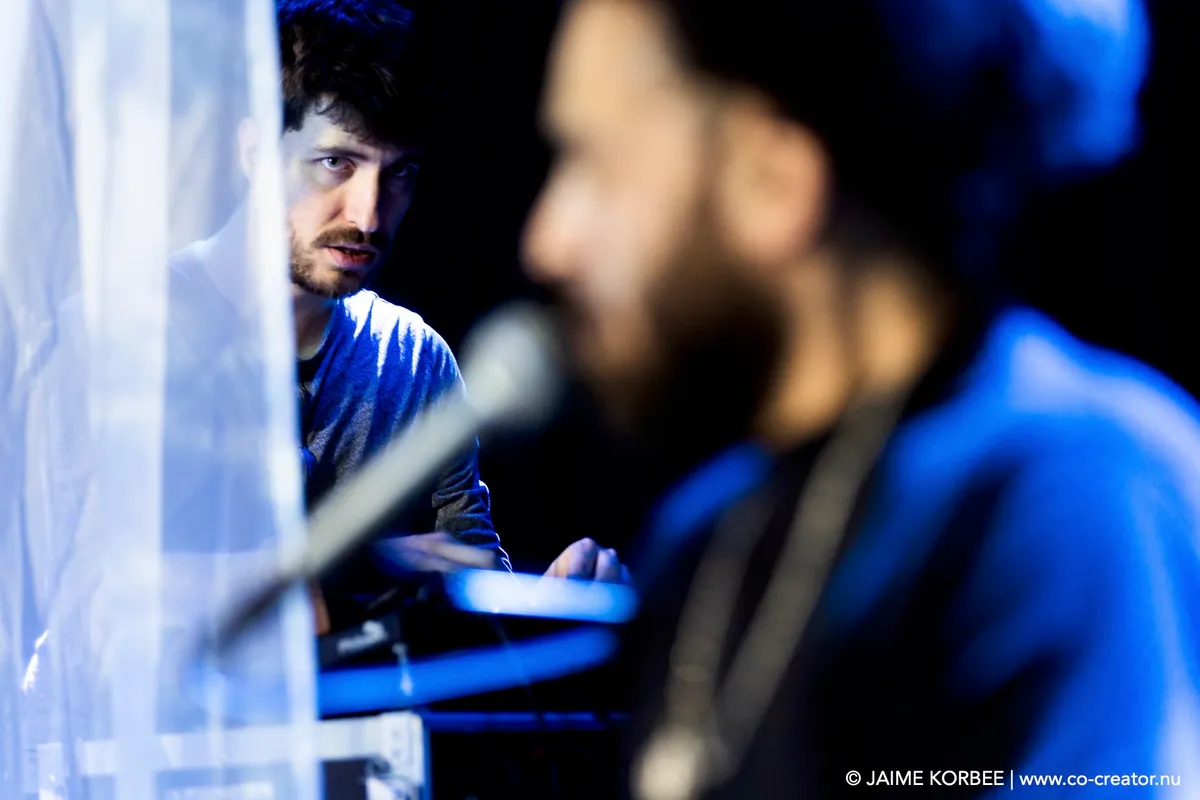 In de Kleine Nobelzaal hangt het podium vol fijnmazige gazen sluiers die doen denken aan klamboes. Daar wordt tijdens het optreden op geprojecteerd: Arabische letters, Rorschach-achtige vlekken, een bovenaanzicht van water met bewegende wolken, als een live weerkaart. De drie artiesten zitten verscholen achter de sluiers: Stef Heeren en Kwinten Mordijck staan achter de synthesizers en Saif Al-Qaissy is de percussionist: hij speelt op darboeka en een tamboerijnvariant: de daf of riq. De daf wordt van onderop verlicht, wat een poëtisch effect geeft; net de volle maan. Gedurende de performance zijn er wat variaties: Kwinten speelt op een baritonsaxofoon en net als we denken dat de artiesten de hele voorstelling verborgen blijven, komt Stef ontsluieren. Hij zingt voor op het podium en in het publiek in het Engels, langzaam telt hij in zijn zang af naar nul, ondersteund door industriële beats met MENA-kruiding. Net als in de omgebouwde foyer hiernaast verandert ook de Kleine Zaal in een club met dansende menigte.
