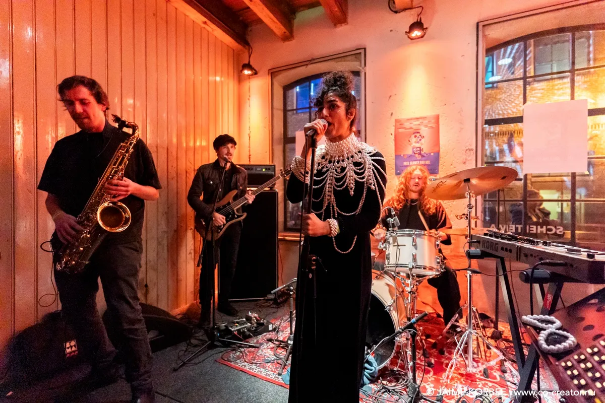 Met zijn vijven staan de bandleden van LQRQ op het piepkleine podium van Expo 0 in Scheltema. De opvallendste figuren zijn de drummer, die met zijn lange rode krullen en baard lijkt op cabaretier Alasdair Beckett-King, en frontvrouw Bagdaddy. Deze Nederlands-Iraakse zangeres heeft een witte zonnebril op en minstens tien vervlochten parelkettingen om, het bedekt haar hele borst, als medailles bij een generaal. Ze maakt bijna meteen ruimte op het podium door met een strak gezicht het publiek in te dansen, een publiek dat splijt als de Rode Zee. Haar soms woedende zang verraadt haar punkachtergrond.