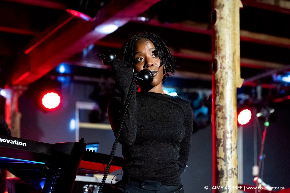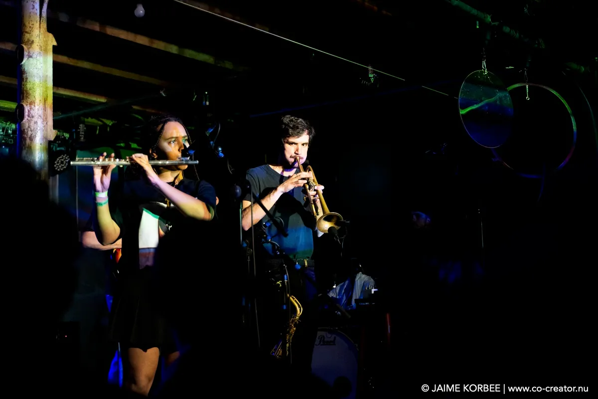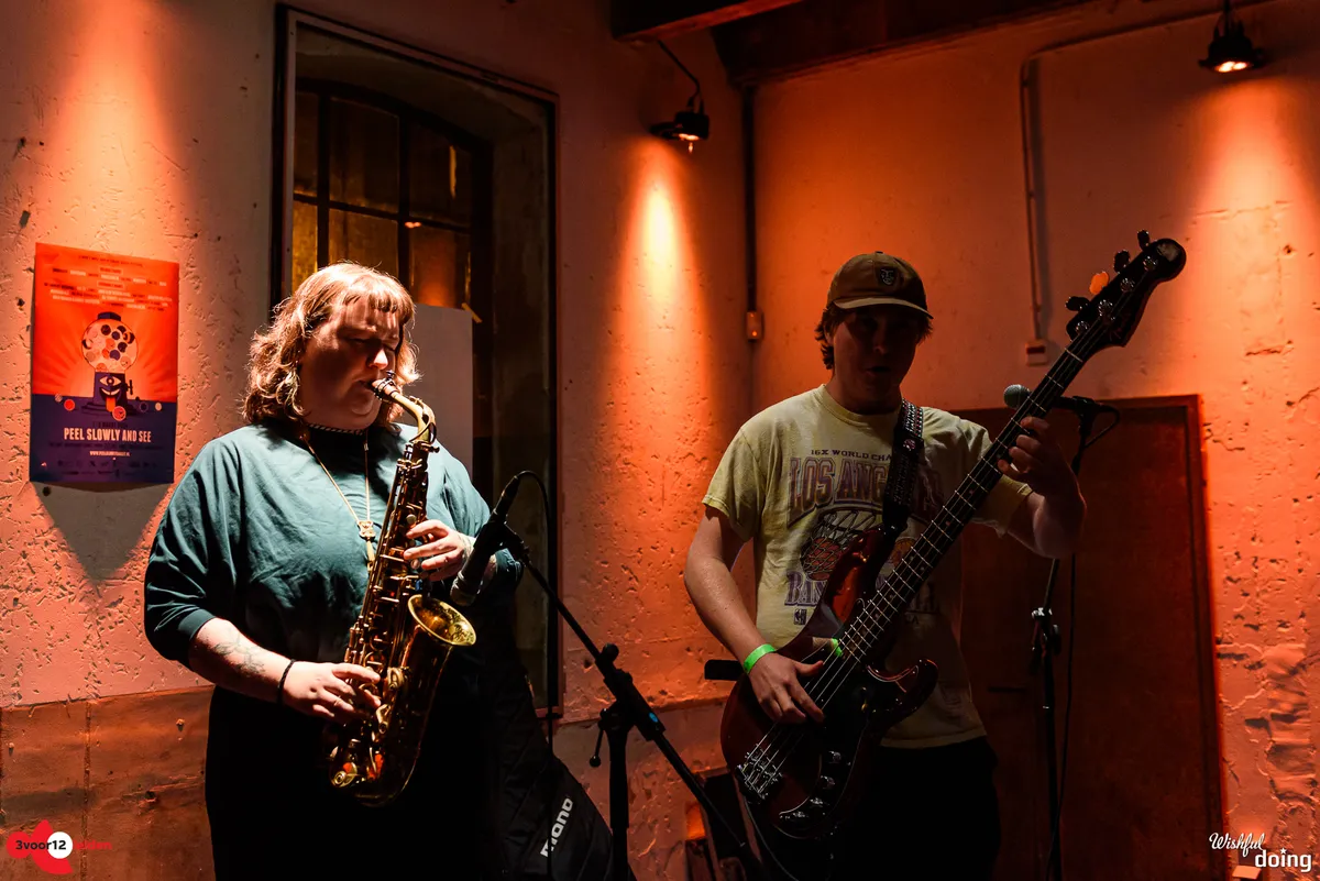 Dolphin Hyperspace is een duo op bas en sax, vergezeld door ongekunsteld loops uit een laptop. In de kleine zaal van het Scheltema doen ze eer aan het ‘hyper’ gedeelte van hun naam, want de muziek is een spitsuur van brass, baslijnen en beats die door elkaar kronkelen zonder ooit in botsing te komen. Het vrolijke duo geeft steeds het stokje aan elkaar qua leiding, met een bassist die helemaal in zijn sas is en dan weer een saxofoniste die het onderste van haar longen laat zien. Hun nummer ‘Baby Parakeet’ is in staat om garage romantisch te laten klinken, met schetterende en sensuele ouvertures die niet zouden misstaan in een film uit de jaren tachtig.