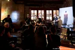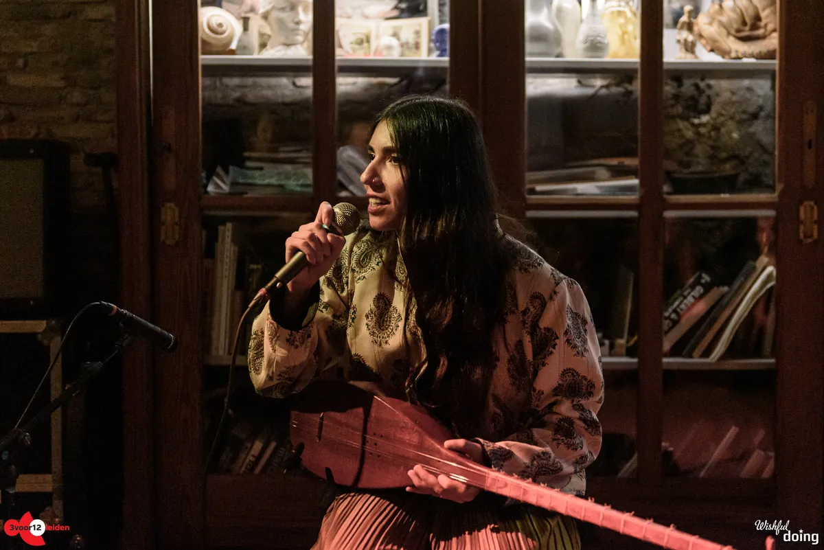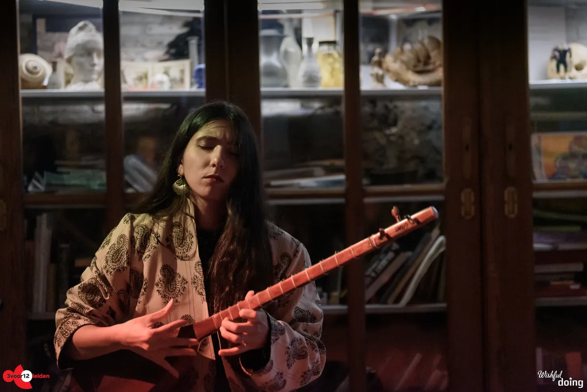De intieme zaal van Marktsteeg 10 lijkt nauwelijks berekend op de grote belangstelling voor de jonge Iraanse muzikante Khorshid Dadbeh. Ondanks het aanvullen van meerdere rijen zitplaatsen moet een grote groep mensen bij de deur en in het gangpad blijven staan om iets van het optreden mee te krijgen. Dadbeh blinkt uit op verschillende Perzische snaarinstrumenten. De tanbour, het instrument dat ze vanavond heeft meegebracht, lijkt een beetje op een luit en doet qua klank aan een sitar denken. Dat geluid kennen de meeste luisteraars vooral van meditatieve Indiase muziek, maar met de snelle ritmes en vele noten die Khorsid speelt is deze performance niet echt meditatief te noemen (en ook niet zo bedoeld). Ze brengt onder meer traditionele (West-)Iraanse stukken ten gehore, afgewisseld met improvisaties. Die ter plekke bedachte lijnen bevatten zoveel noten dat we het shredden zouden noemen als het op een elektrische gitaar gespeeld zou worden.