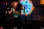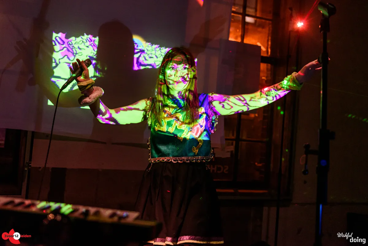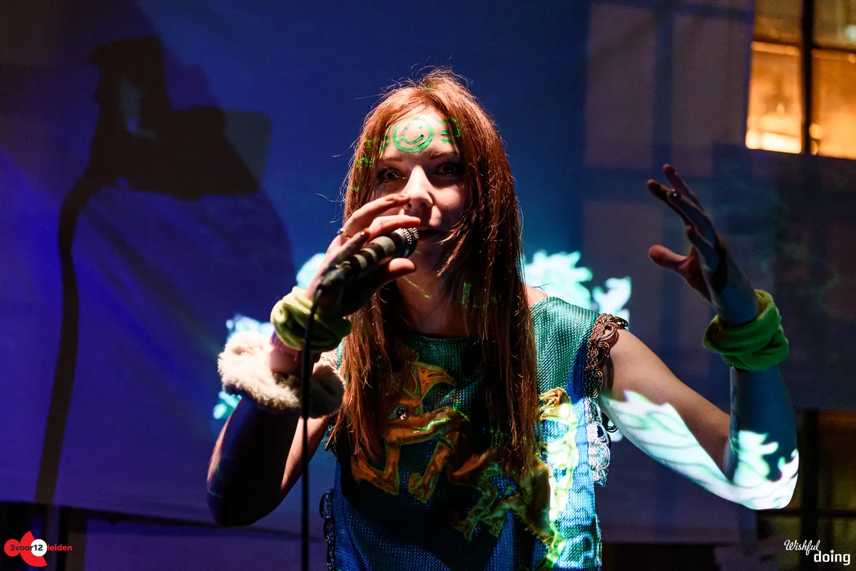 Kleurrijk gekleed, met een geschminkte smiley op haar voorhoofd, polkadots op haar panty en pompoms op haar schoenen stuitert de IJslandse dj. flugvél og geimskip (in het Nederlands: vliegtuig en ruimteschip) op het podium in de foyer van Scheltema. De IJslandse muzikante, die in het dagelijks leven de naam Steinunn Eldflaug Harðardóttir draagt, neemt ons met haar speelse collage van elektronica en psychedelische visuals mee op een sprookjesachtige technotrip naar het ontstaan van de Aarde. Wat volgt is een originele en dansbare interpretatie van hoe de Big Bang moet hebben geklonken. Behalve het aansturen van de beats en bliepjes zingt de IJslandse ook nog en speelt ze keyboard, mondharmonica en otamatone, een Japans elektronisch instrument in de vorm van een muzieknoot met een gezicht erop, dat een eigenzinnig bliep-geluid maakt. Als ze even haar handen vrij heeft, fladdert ze als een dansend elfje over het podium. De kleurrijke visuals en happy hardcore-achtige beats doen denken aan de jaren negentig. Uw recensent krijgt er zin van om te gaan hakken, maar helaas lijkt de rest van de toeschouwers er niet voor te voelen om uitbundig te dansen. Tot twee keer toe stapt flugvel og geimskip het publiek in, maar een echt opzwepend effect heeft dat niet. Toch vraagt de zaal na afloop om een toegift. Die krijgen we: in de vorm van een IJslands slaapliedje waarbij het publiek mag meezingen.