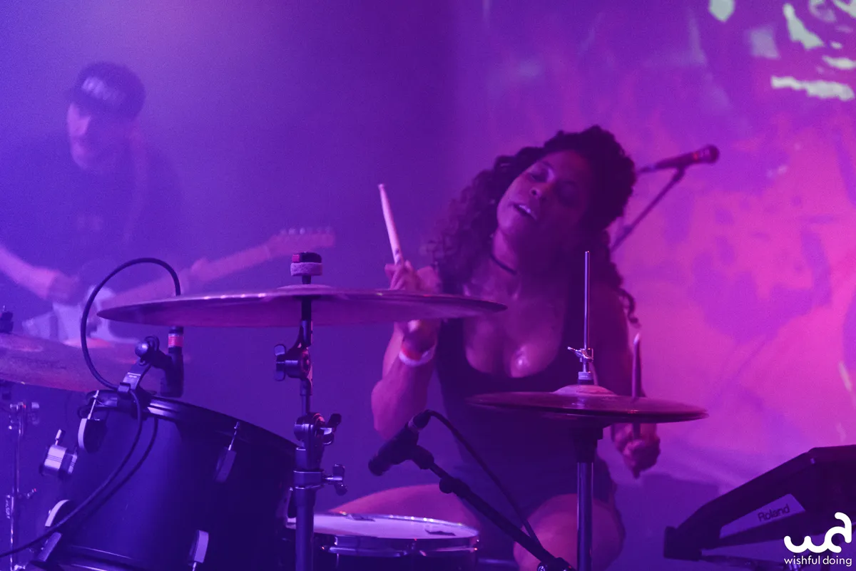 Het energieke Chew uit Atlanta (VS) trapt de avond af in Resistor. Dit trio brengt psychedelische postrock met funky beats, scheurende gitaren, beukende bassen en ingenieus ingezette samples. Temidden van gitarist Brett Reagan en bassist Brandon Pittman is het drumstel van Sarah Wilson prominent opgesteld. Mede door deze positionering, maar ook door haar charismatische verschijning en dynamische performance, lijkt Wilson de ‘aanvoerder’ van dit trio. Haar ritmes zijn in elk geval een drijvende kracht in de muziek. Meteen in het eerste nummer gaat ze al dusdanig los dat een onderdeel van haar drumstel valt en in de zaal terechtkomt. Gelukkig brengt een toeschouwer het terug en kan het weer vastgemaakt worden. Dit laat wel zien hoe – soms letterlijk – explosief haar spel kan zijn.