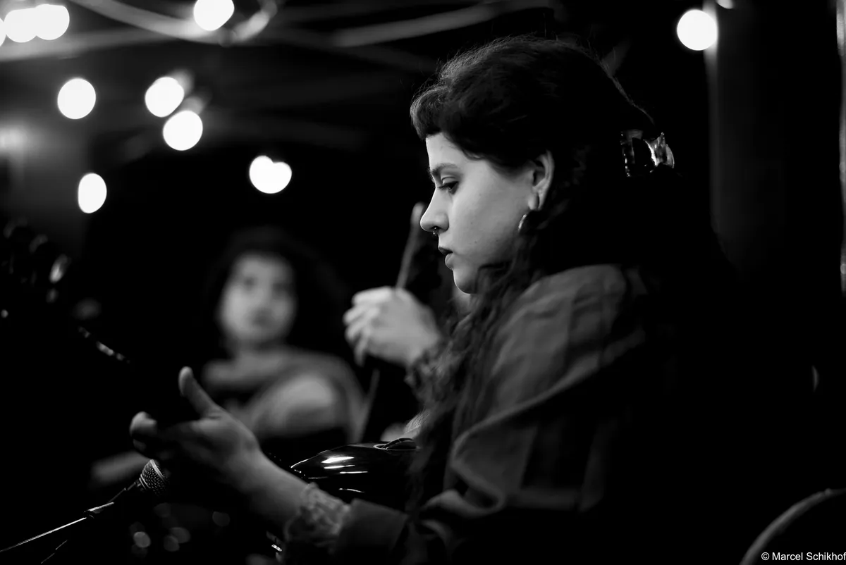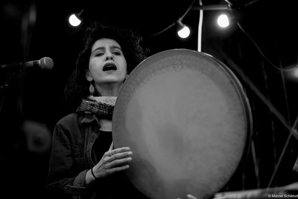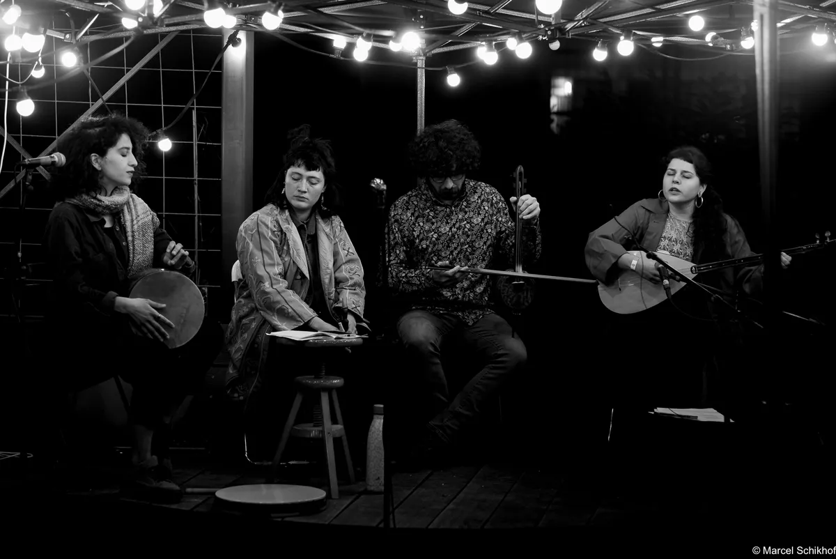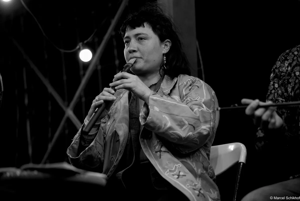 Nasîn bestaat uit Zilan Hasret Yıldız op de daf (trom uit het Midden-Oosten), Ruşen Can Acet op de kabak kemane (Turks strijkinstrument), Lucie Rosann Lelaurain op fluit en duduk (Armeens blaasinstrument), en Bori Mályi op saz (een soort luit). Alle vier doen ze ook vocalen in wisselende combinaties, onversterkt op de binnenplaats bij ROEM, onder een tent met eigenlijk iets te felle verlichting. Mik liever ondanks de brandveiligheid een paar vuurkorven neer, want de verhalende liederen in het Turks, Armeens en Koerdisch voelen aan alsof ze van generaties terug dateren. Ook voor de mensen die de Duolingo-uil wel kunnen afschieten is de bedoelde stemming steeds goed te ontwaren.