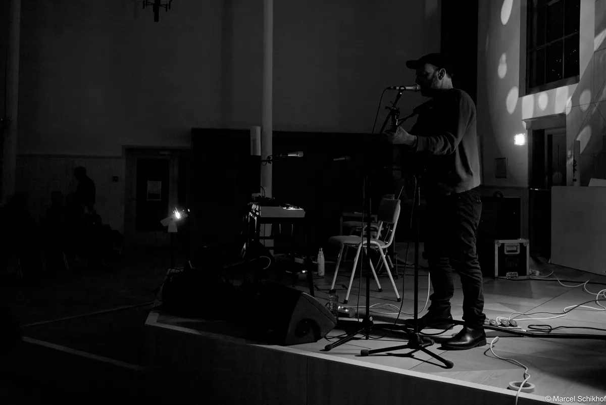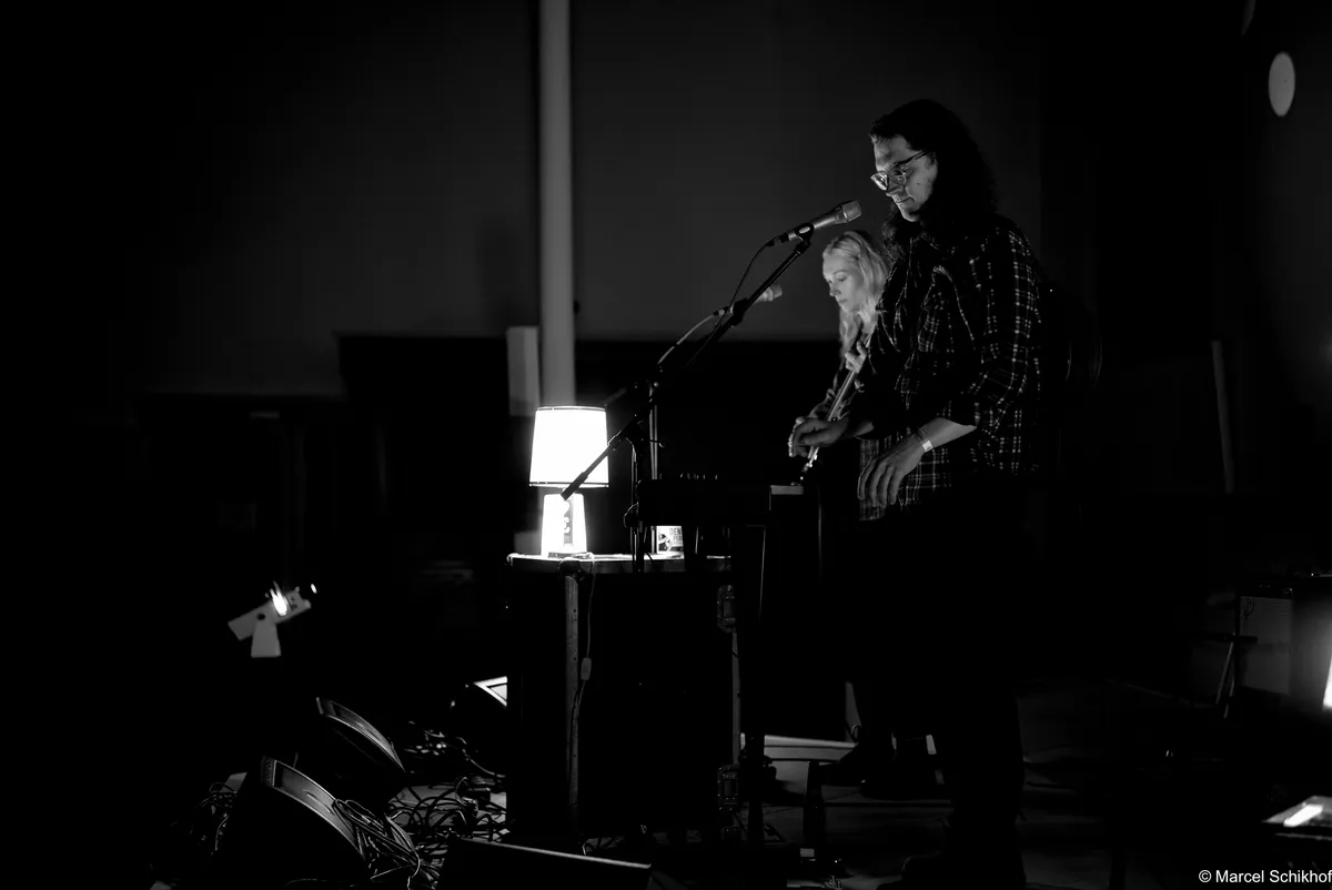 Peel Slowly speelt op een extra, nieuwe locatie: de Herengrachtkerk. Deze Nederlandse Gereformeerde Kerk is groot, kaal en stemmig. De akoestiek is uiteraard prima. In het bijna-donker zijn de vloeistofdia’s goed te zien, met rondcirkelende rode, gele en roze bollen tegen een blauwe achtergrond.