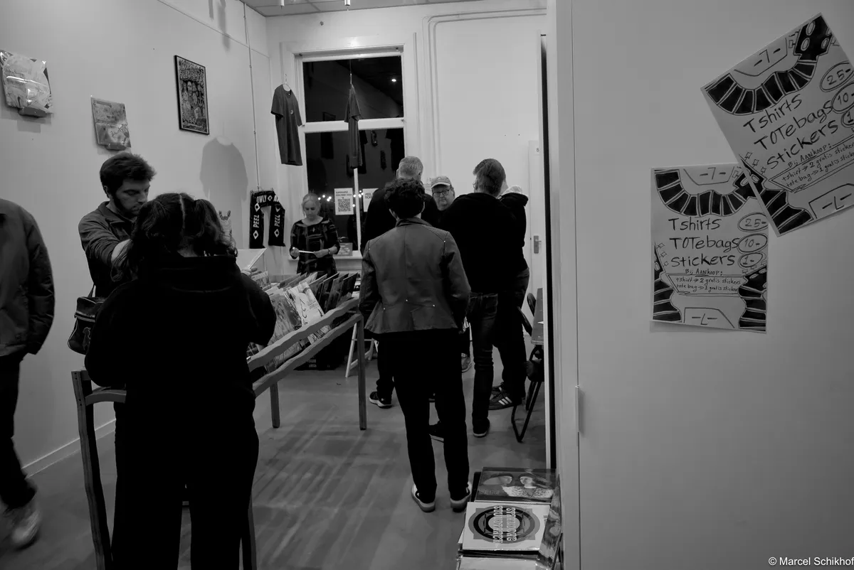 Over artiesten gesproken: Sanne Bet, winnares van de Fiep Westendorp Stimuleringsprijs, maakt ter plekke CD-covers. Ze vraagt wat het onderwerp moet zijn en maakt daar met vulpen in een paar minuten een tekening bij. Een ROEM-muzikant doet een performance als Lichaamstaal (zie hieronder): hij stemt non-stop zijn gitaar. In een hoekje kun je voor het eerst PSAS-merch kopen, zoals stickers en een sjaal.