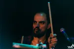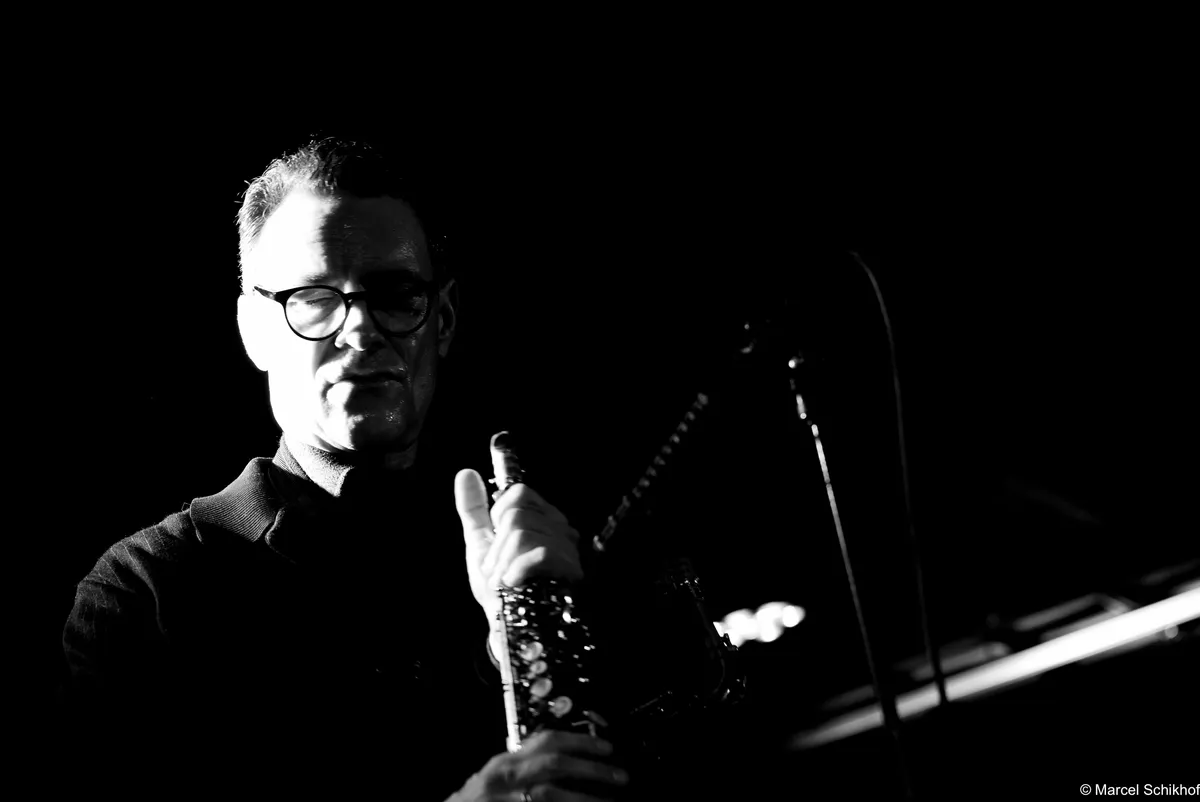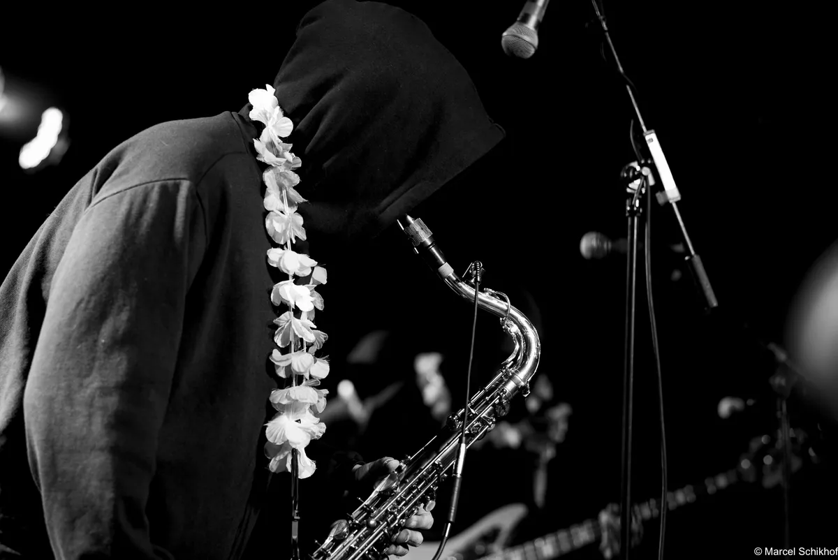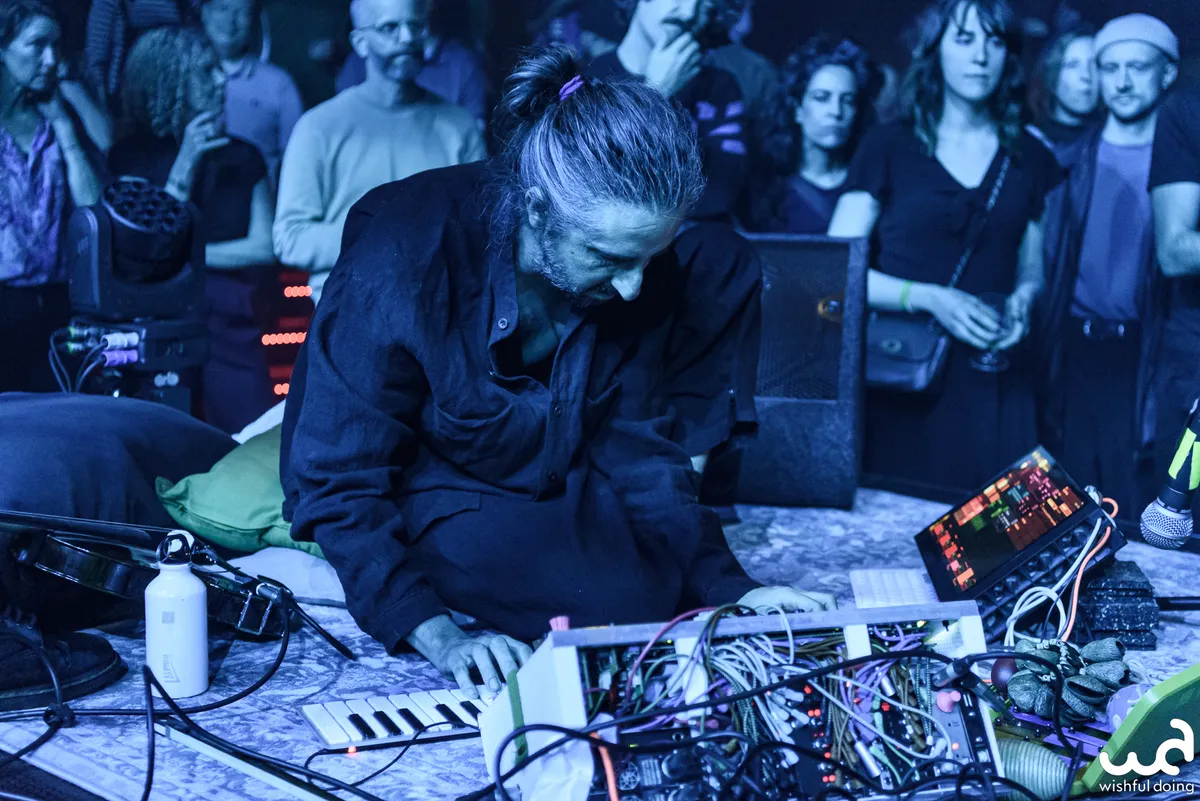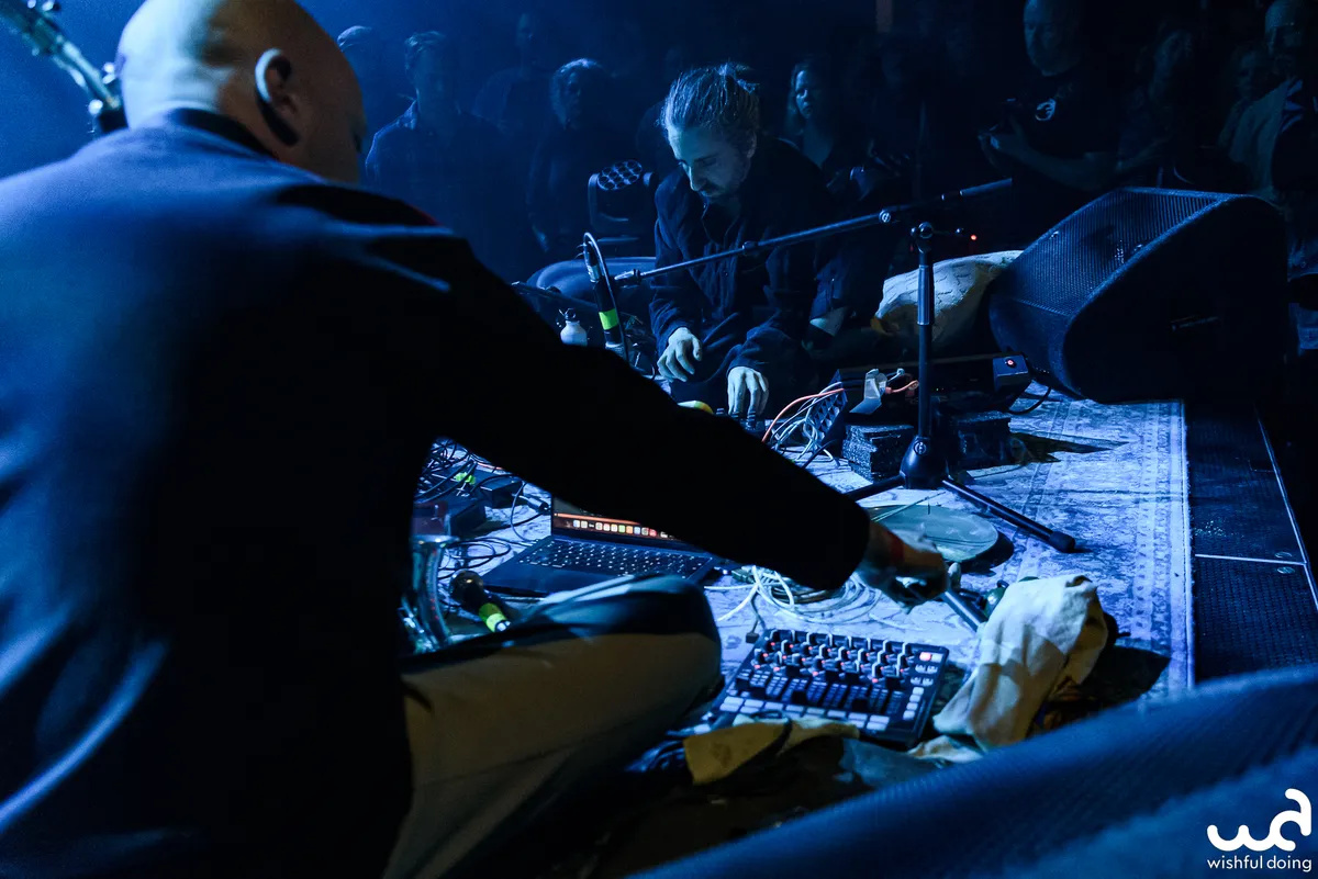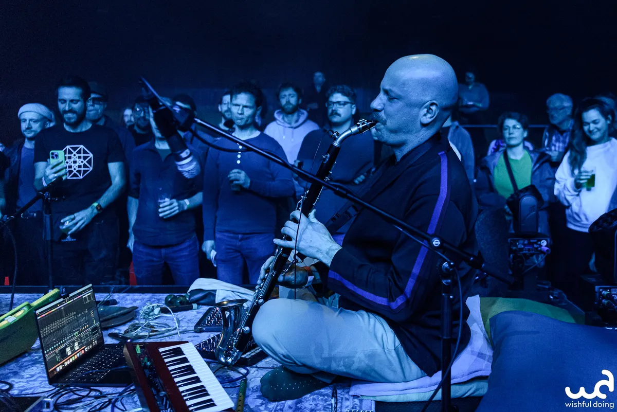 Het licht dooft verder en de geur van wierrook vult de ruimte. Synthesizer en zwaar bewerkte saxofoonklanken weven stemmige drones door de zaal. Er hangt een onmiskenbare oldschool electro-vibe in de lucht. De auto-arpeggio-module draait overuren. De eindversterking is op z'n zachtst gezegd stevig, waardoor fijne details in het geluid soms verloren gaan. Maar daar staat tegenover dat we worden meegevoerd door een kolkende rivier van bastonen van de steeds megalomaner wordende drones.