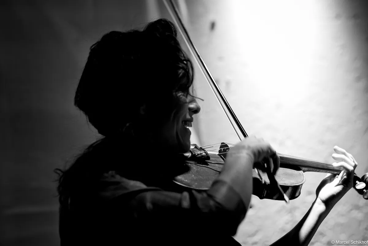 In een propvol M10 brengt de Iraniër Saba Alizadeh ons een combinatie van elektronica en kamancheh. Dat is een Perzische puntviool met een klankkast die aan de achterkant bol is. Saba zet hem op de tafel en bespeelt hem razendsnel met een strijkstok. Het geluid klinkt klagelijk en contemplatief.
