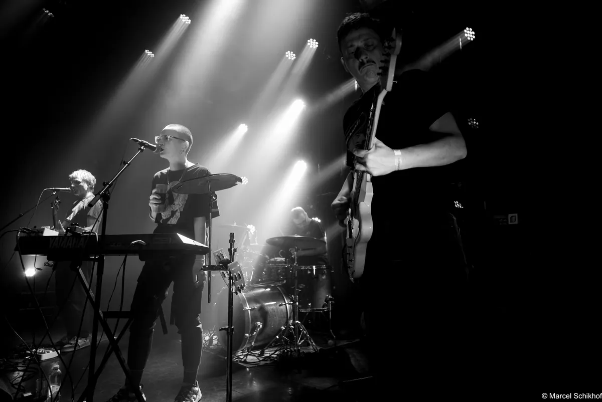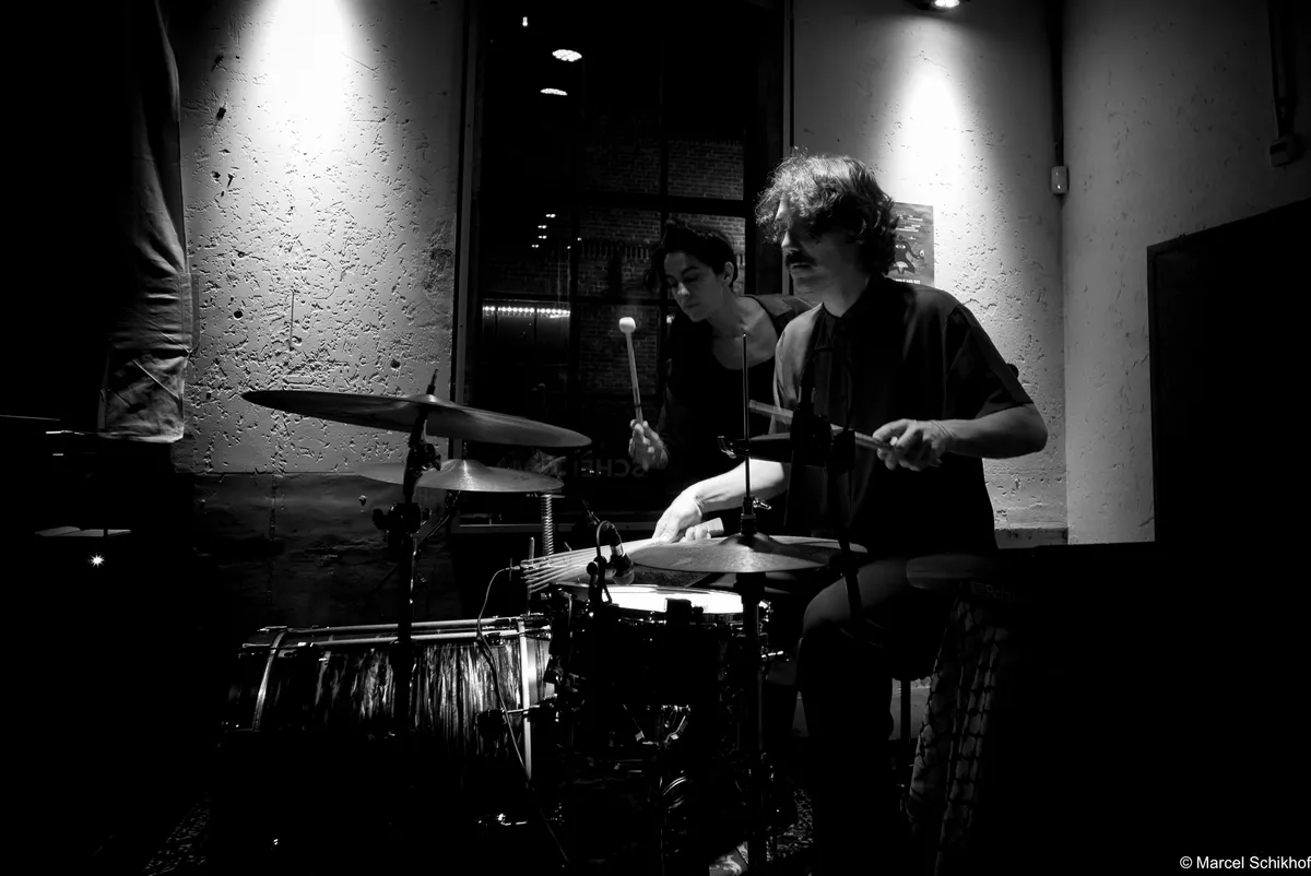 Naast keyboard speelt Agata Horwat vanavond veel meer: tamboerijn, hi-hat, shaker, en is ze afwisselend achtergrond- en frontzangeres. Binnen hetzelfde nummer switcht die rol steeds tussen bassist Łukasz Plata en haar. Gitarist Hubert Kostkiewicz speelt in ‘Blok’ een surfrockriffje, maar dan met veel delay en heel ijl klinkend, als een xylofoon.