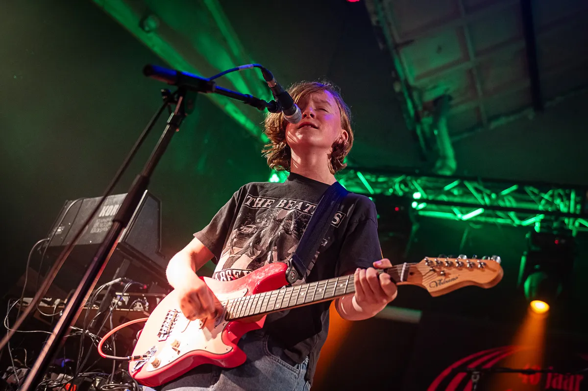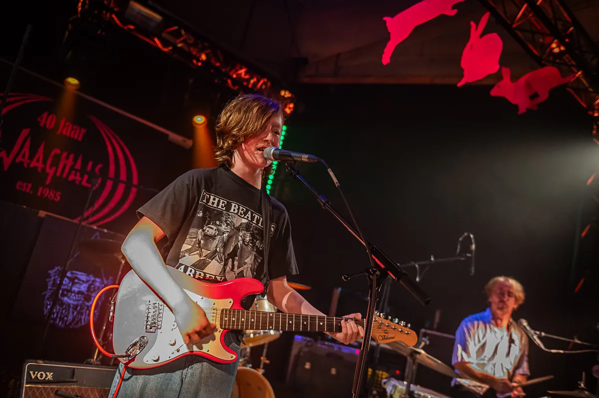 Het Vlaamse Kipgeweer trapt af met een mooie set eigen nummers. De 12-jarige (!) Neo Deweze brengt ze met verve op gitaar en zang, begeleid door zijn vader Pascal (bekend van de band Metal Molly, ooit op een eerder label van Waaghals) op drums. Energiek, gedurfd en razend echt, zowel qua spel als teksten. De ad hoc afwezigheid van de bassist doet niet hoorbaar afbreuk aan de muziek, vader en zoon kijken elkaar af en toe aan bij een missend baslijntje, maar spelen net zo hard door. Zeker richting het einde van de set gooit Neo zijn mond open dat het een lieve lust is. Die komt er wel.