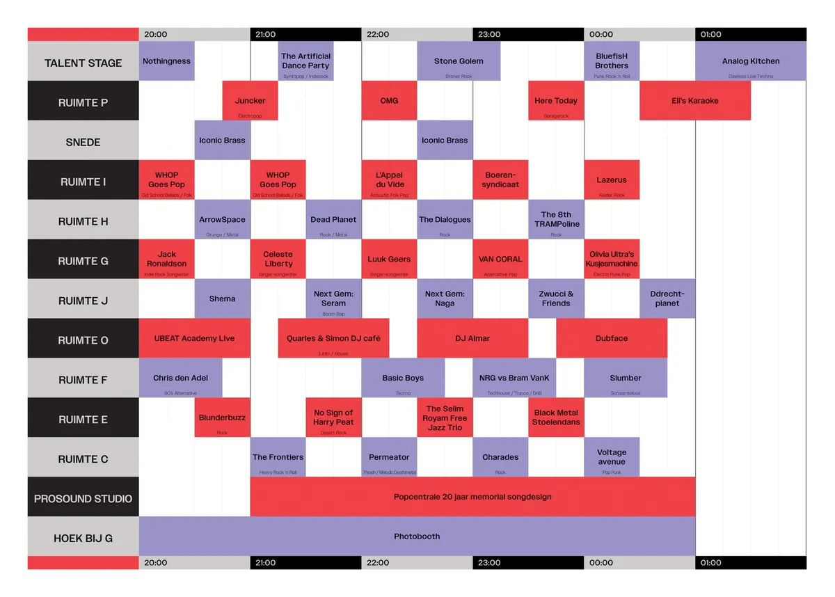 Het Popcentrale 20 jaar Festival is een showcase van de Dordtse muziekscene. Met 50 acts verdeeld over 11 verschillende ruimtes laat de Popcentrale zien dat er vele bands oefenen
