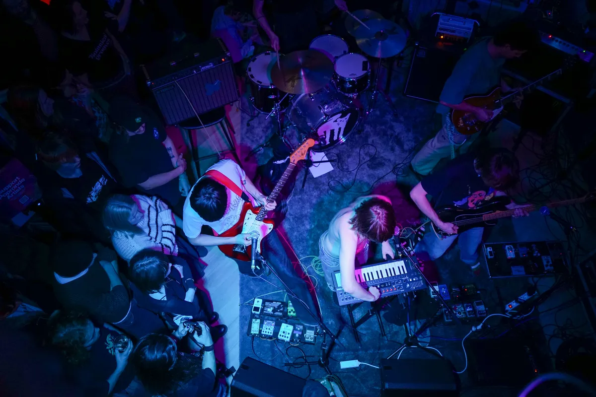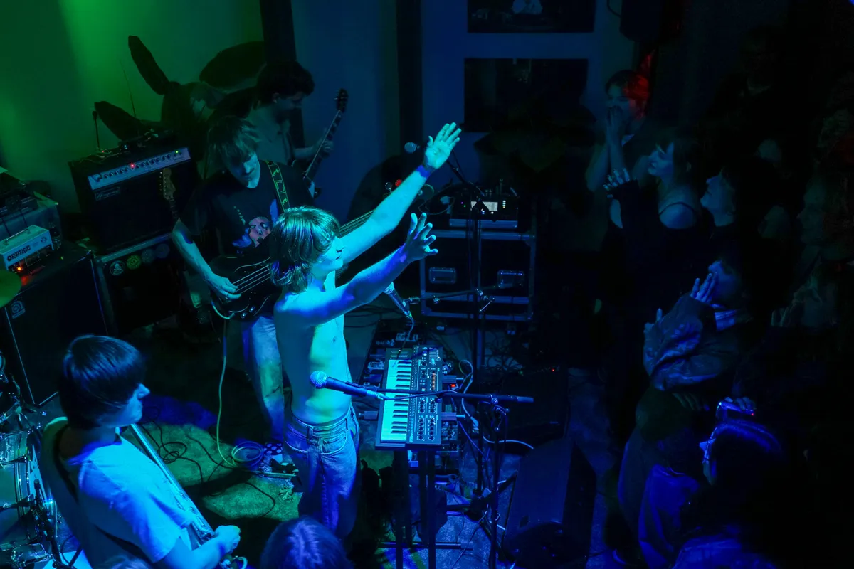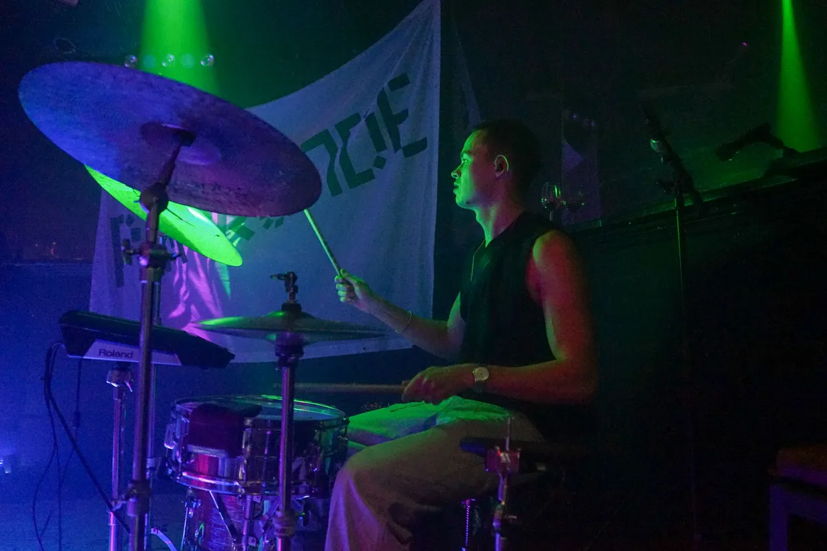 In KOSMIK was de sfeer explosief: de ruimte zat vol, de hitte van de zaal maakte de lucht zwaar en de energie van Fit zorgde ervoor dat iedereen meteen in beweging kwam. De vijfkoppige band stond op sokken, zweetdruppels vlogen door de lucht, ramen besloegen en mensen dansten op elke vierkante centimeter.