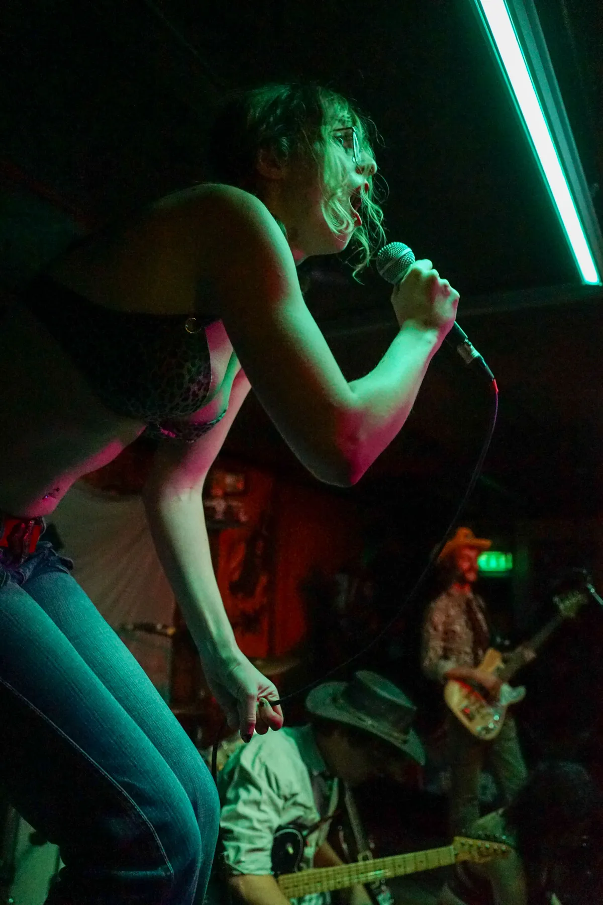 In de Boothill Saloon naast de Onze Lieve Vrouwetoren, blies de collectieve punkontlading van CLITTEBAND ons omver. De zaal was donker en bomvol met mensen en adrenaline. De frontvrouw trok het publiek meteen naar zich toe: “Mijn lichaam als seksobject, mijn lichaam als porno – kijk maar!”, brulde ze springend op het podium. En daarna: ‘’Vrouwen moeten veilig over straat kunnen lopen!’’ Je voelde direct de woede die in elk woord zat. Het was een boodschap en een gevoel tegelijk — feminisme, trans rights en Free Palestine kwamen keihard voorbij, maar altijd met ritme en agressie die je niet kon negeren.