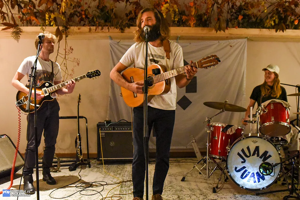 In de Kloeveniersdoelen worden we aangenaam verrast door Juan Juan die vanuit Amsterdam naar Zeeland is afgezakt. Juan Juan is het alter ego van Gertjan van de Geer en hij speelt live samen met een drumster en bassist. Het trio heeft zo zijn eigen stijl met Latijns Amerikaanse invloeden. Ze mixen een rammelig Velvet Underground geluid met alternatieve countryrock. Het doet ons een beetje denken aan de vroege Hallo Venray.